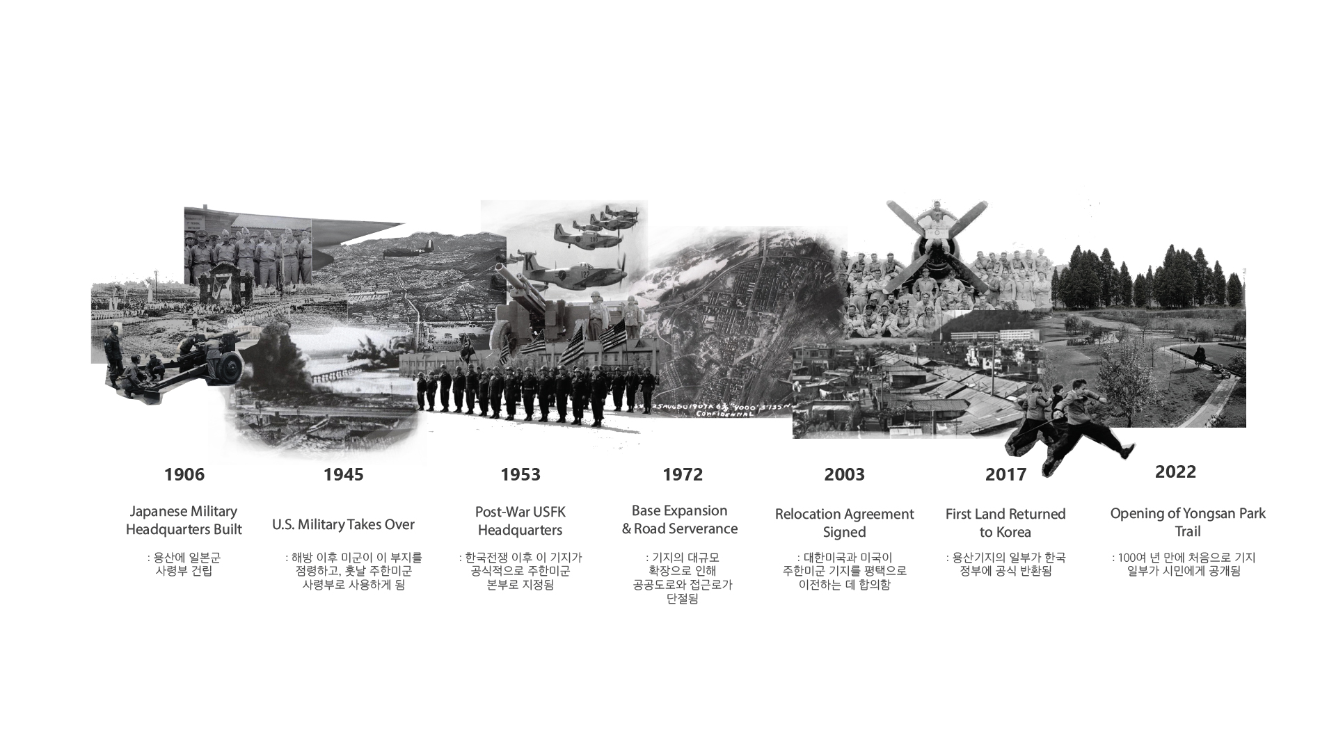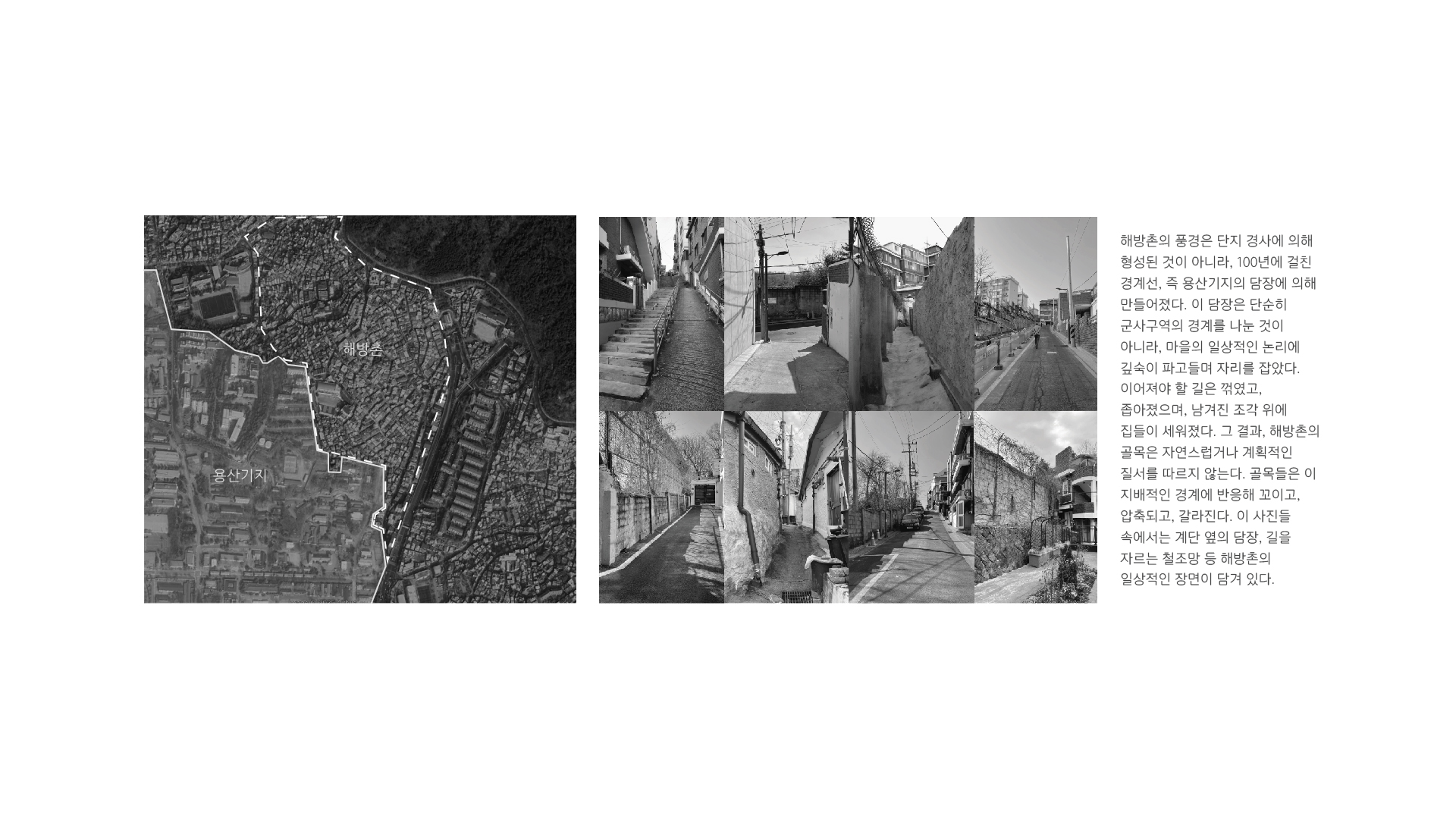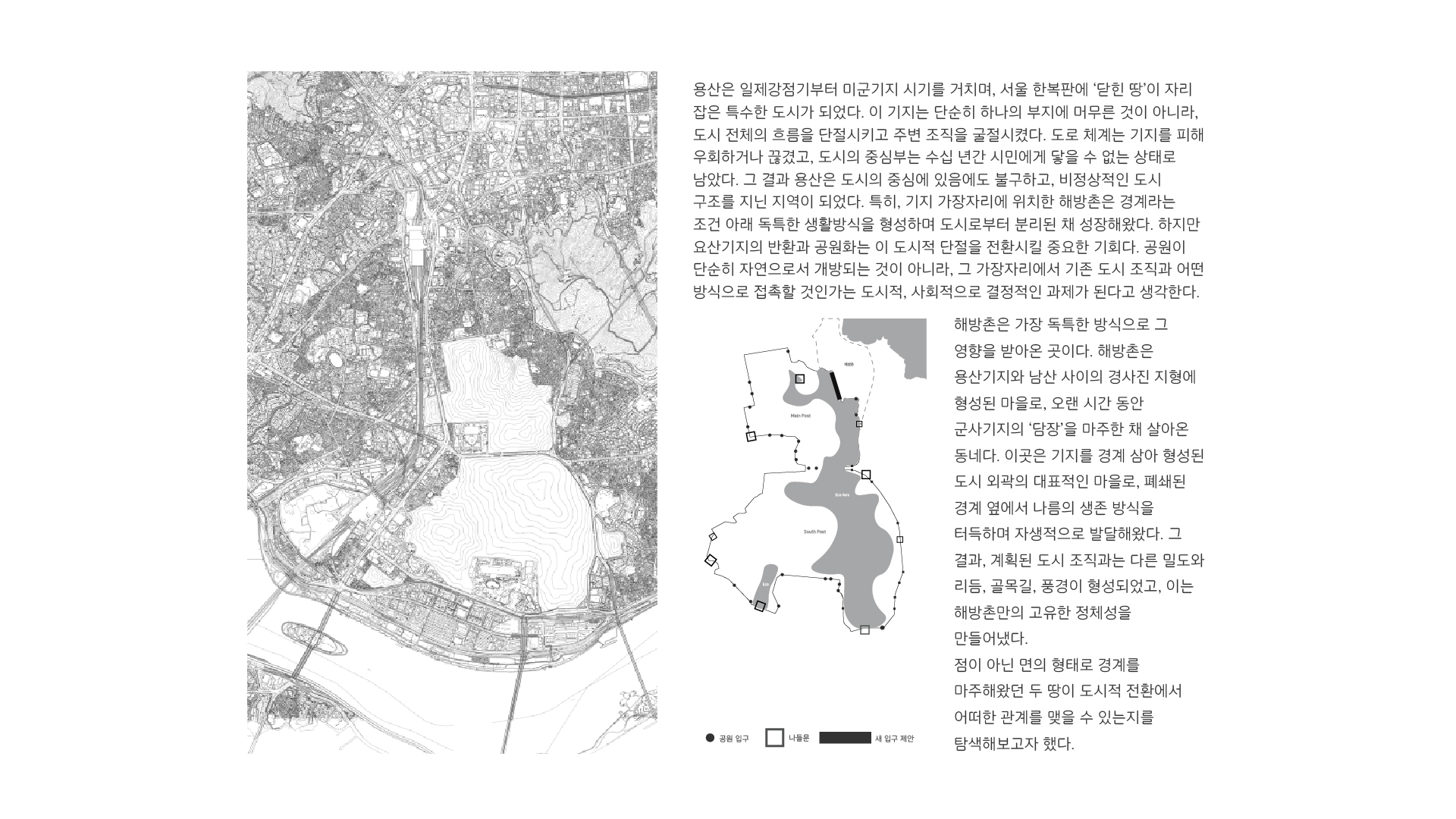 용산이라는 땅은 지난 120년간 군사기지로 사용되며 주변과 철저히 단절되어 왔다. 담과 도로로 둘러싸인 이 거대한 영역은 오랫동안 ‘금단의 땅’으로 존재했다. 그 결과 남산과 용산기지 사이에 끼어 있던 해방촌은 어디로도 확장되지 못한 채 높은 밀도로 형성되었고, 주민들이 함께 모일 수 있는 공공장소는 항상 부족했다. 특히 해방촌과 맞닿는 일부 구역은 군사적 목적에 따라 내부의 경사 지형이 계단식으로 조성되면서 뚜렷한 레벨 차이가 생겼고, 높은 담으로 둘러싸여 더욱 고립되었다.