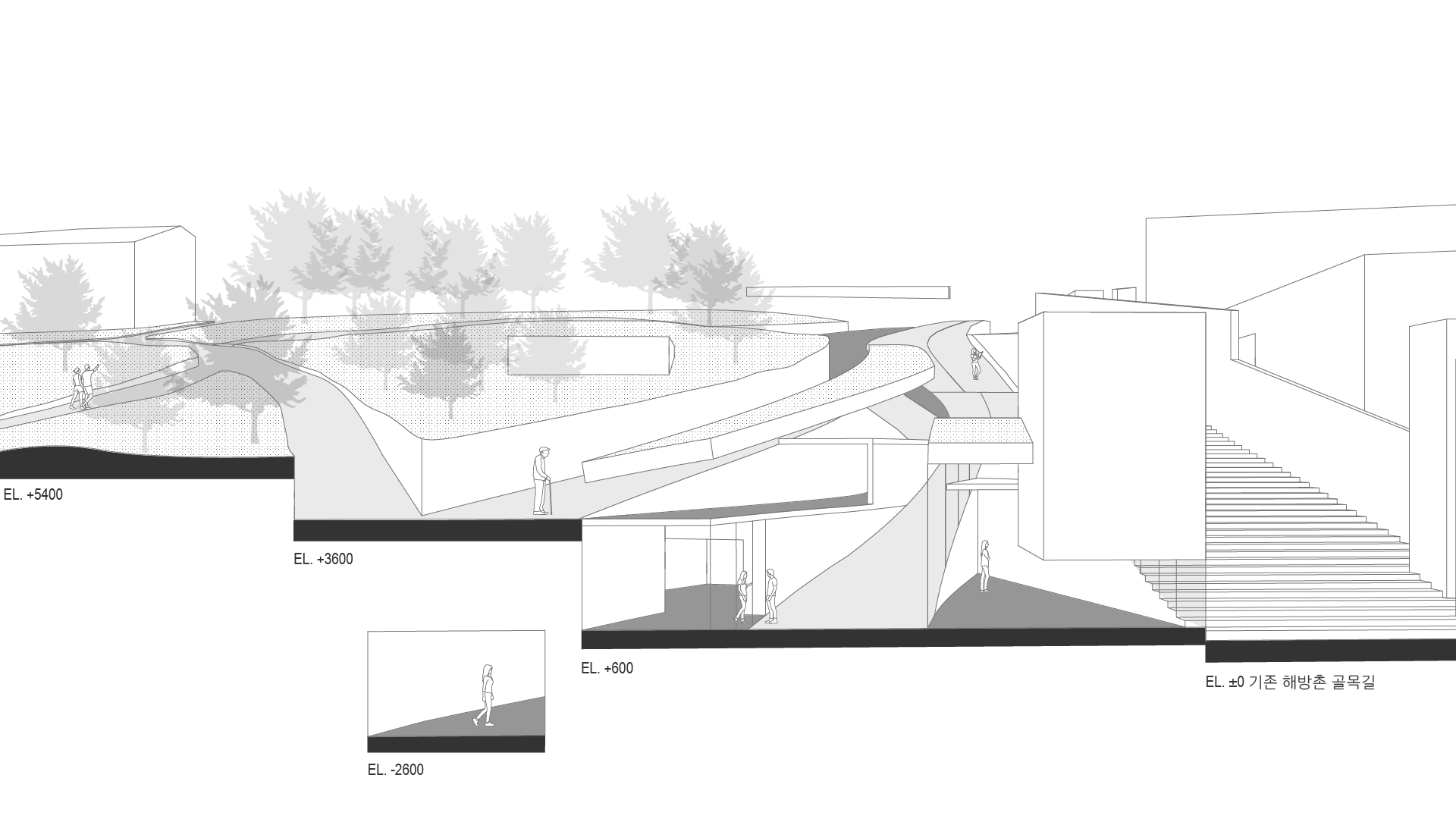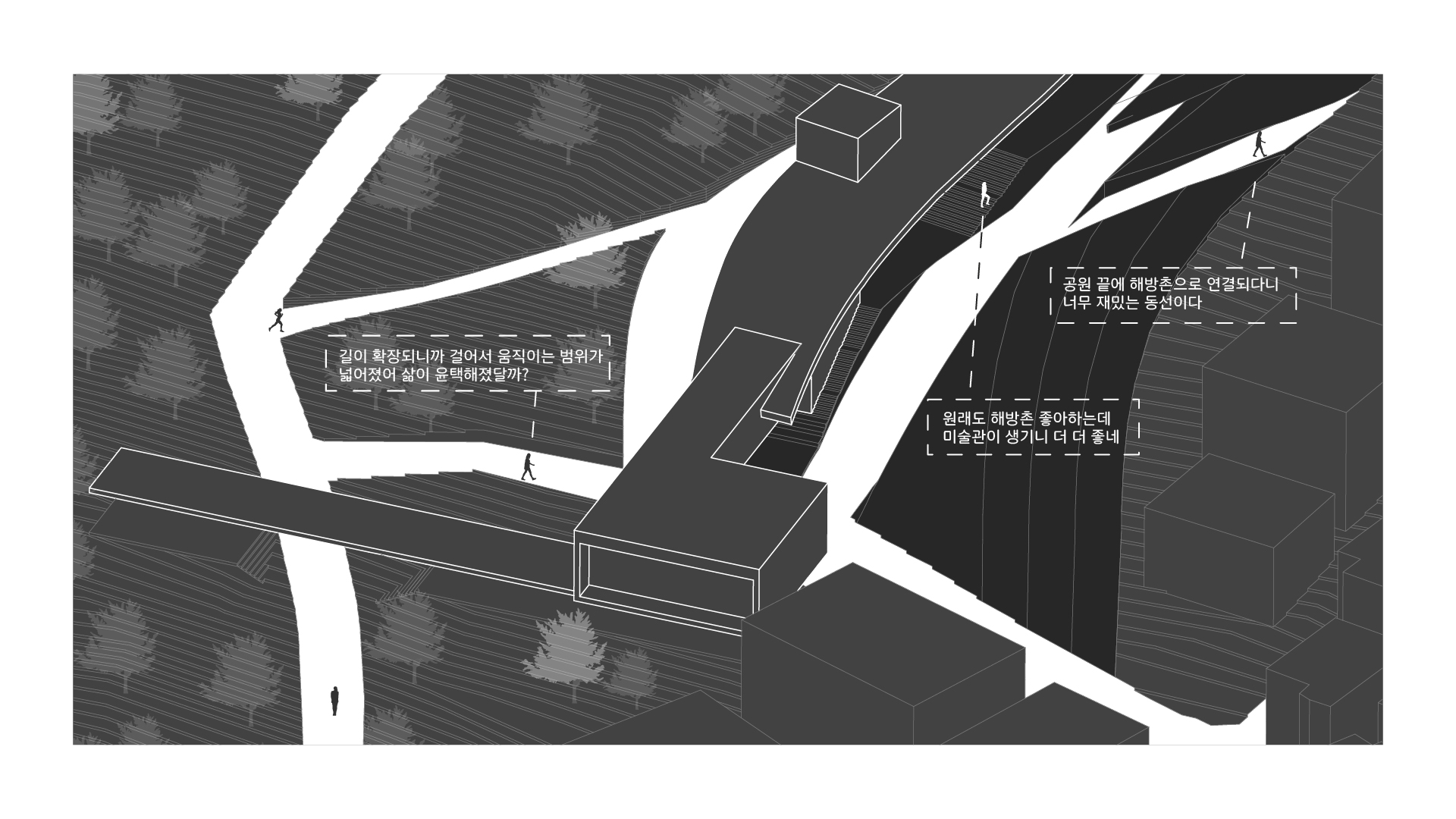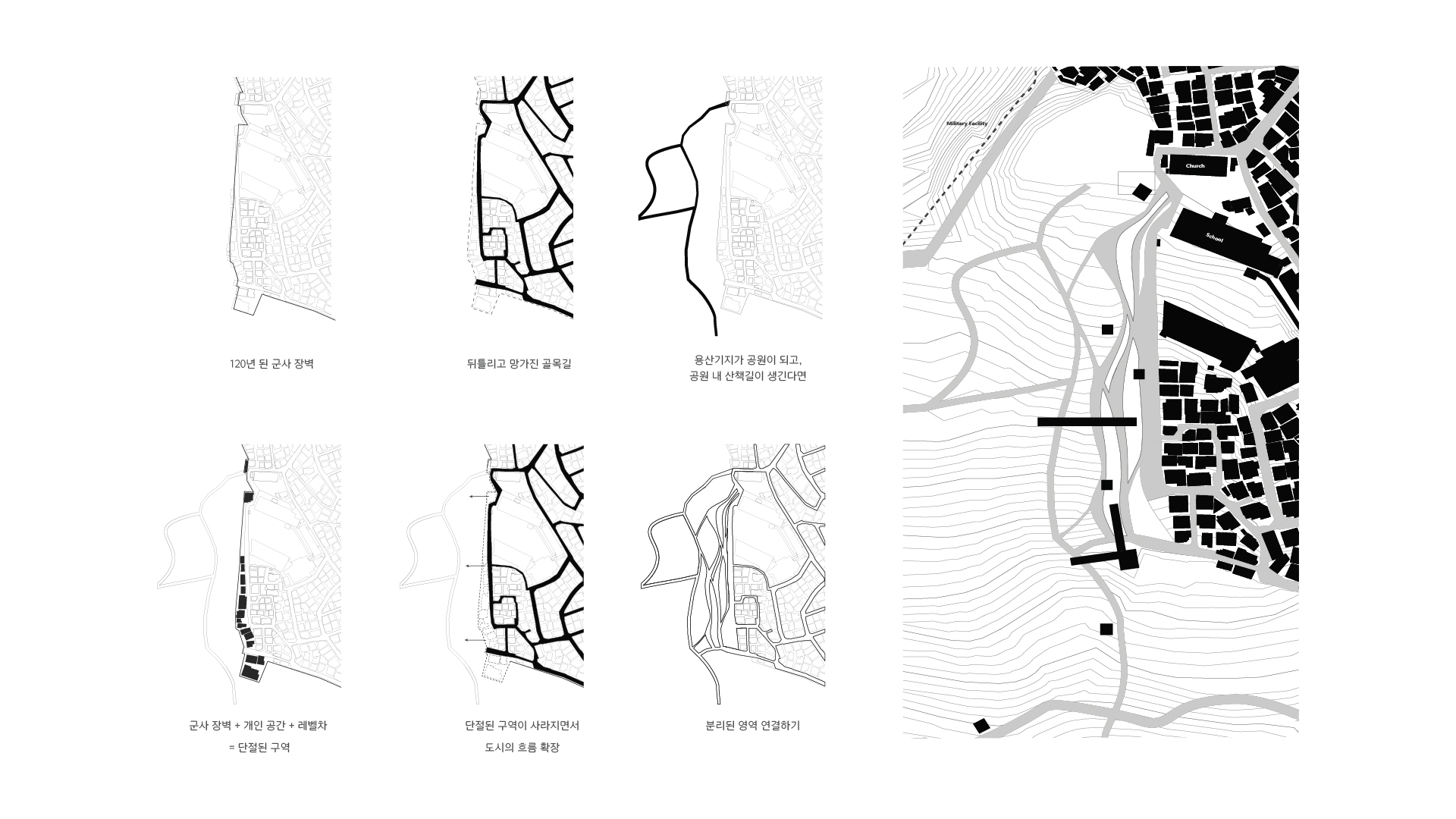 현재 용산기지는 공원화가 추진되고 있다. 그러나 오랜 단절과 레벨 차이는 단순한 물리적 연결만으로는 해소되지 않는다. 이 차이를 극복하기 위해 하나의 단일한 레벨로 맞추는 대신, 다양한 레벨을 풀어내는 방식을 제안한다. 즉, 기지와 주변 지역 사이에 중간 스케일의 완충지대를 마련하고, 계단식 지형에서 발생한 단차를 단계적으로 해소하는 것이다. 이를 통해 두 땅은 스케일과 레벨의 차이를 완화하며, 단절을 넘어선 새로운 관계를 회복할 수 있다. 기존의 ‘선’적인 골목길은 입체적이고 ‘면’적인 공간으로 확장되어, 사람들이 머물며 소통할 수 있는 공공적 장치가 될 수 있다.