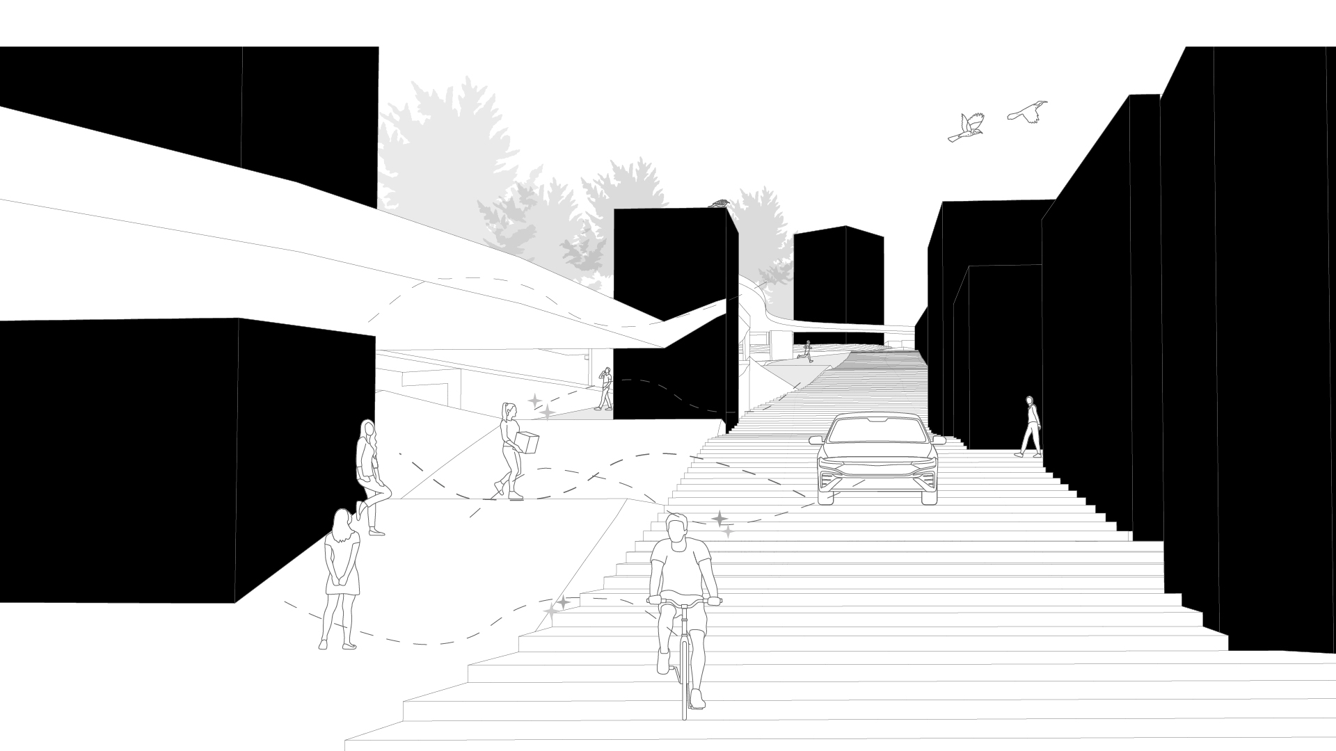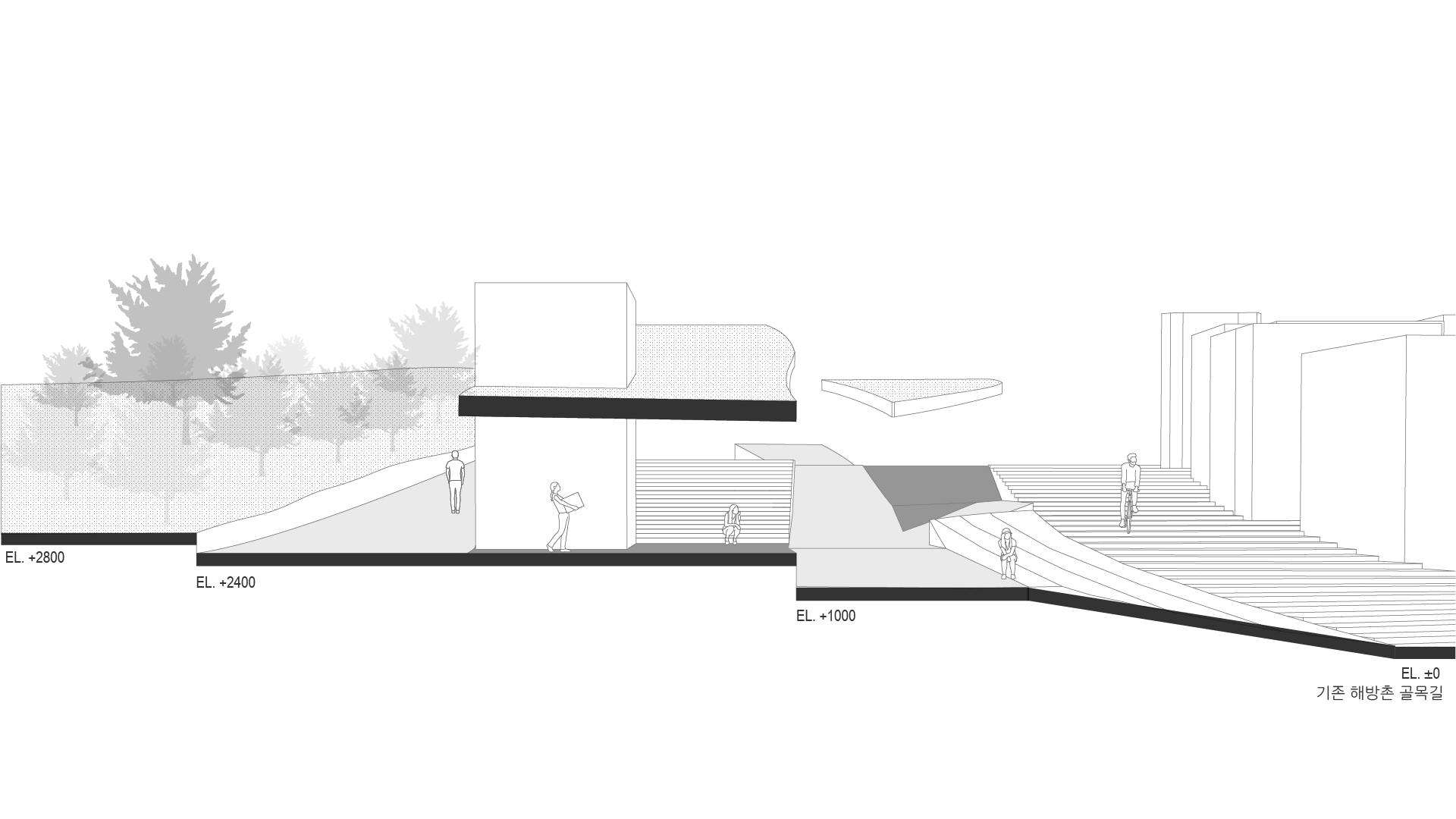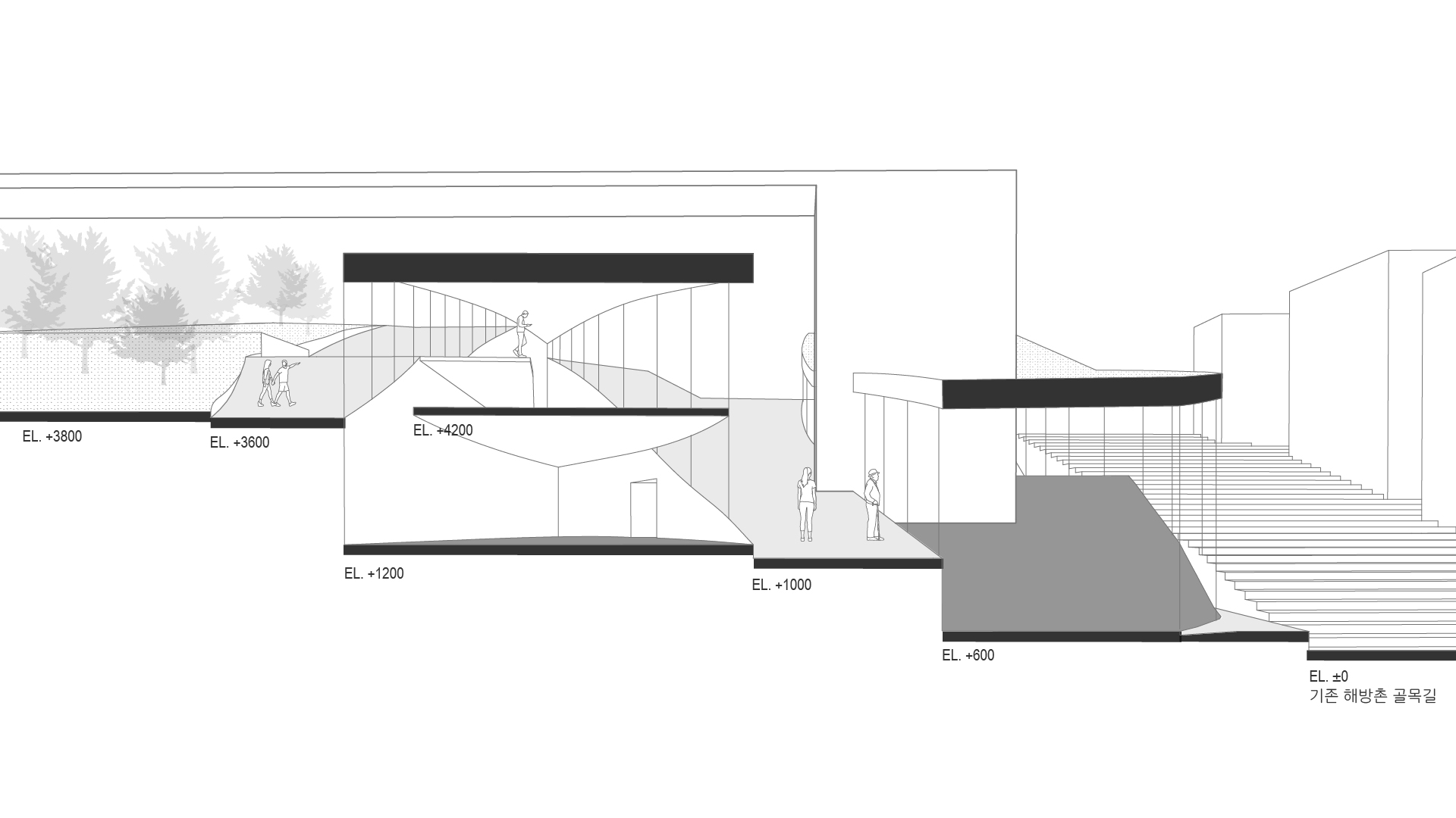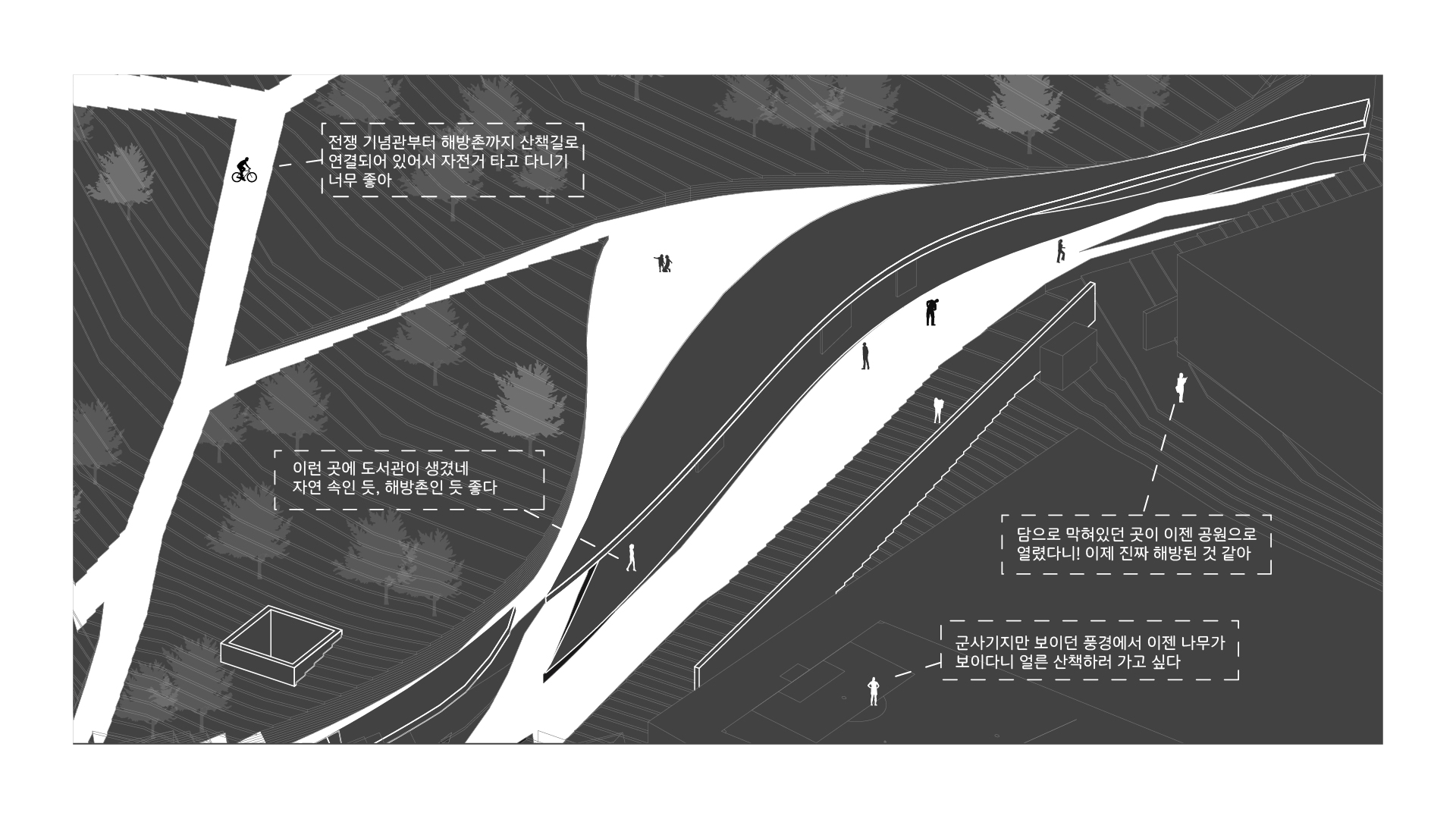 현재 용산기지는 공원화가 추진되고 있다. 그러나 오랜 단절과 레벨 차이는 단순한 물리적 연결만으로는 해소되지 않는다. 이 차이를 극복하기 위해 하나의 단일한 레벨로 맞추는 대신, 다양한 레벨을 풀어내는 방식을 제안한다. 즉, 기지와 주변 지역 사이에 중간 스케일의 완충지대를 마련하고, 계단식 지형에서 발생한 단차를 단계적으로 해소하는 것이다. 이를 통해 두 땅은 스케일과 레벨의 차이를 완화하며, 단절을 넘어선 새로운 관계를 회복할 수 있다. 기존의 ‘선’적인 골목길은 입체적이고 ‘면’적인 공간으로 확장되어, 사람들이 머물며 소통할 수 있는 공공적 장치가 될 수 있다.