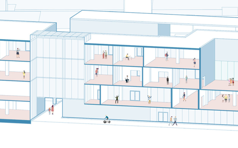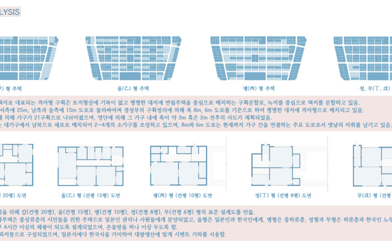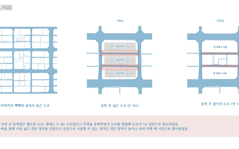 빽빽하고 좁은 골목길을 두고 건물과 건물들이 서로 끈끈하게 엮어있었고, 하나의 유기체와 같다는 점에 주목했다. 본 프로젝트에서 엮이고 엮인 영단주택 단지의 가로를 강조하면서 공공성을 가질 수 있는 틈을 형성하고자 했다.