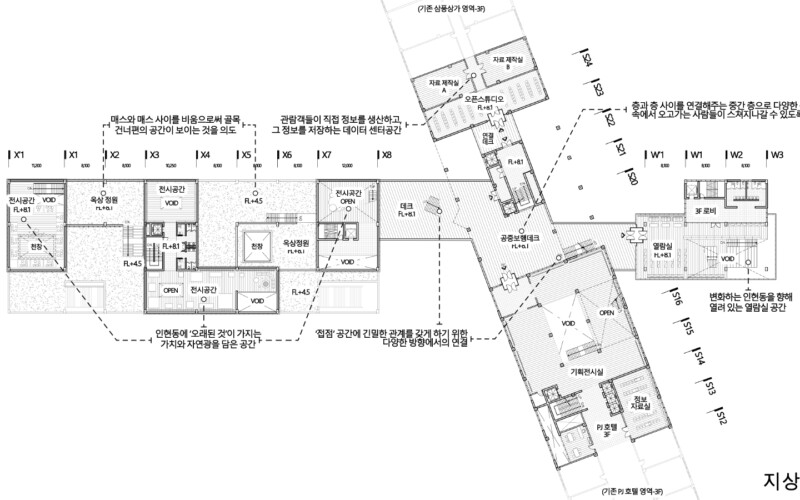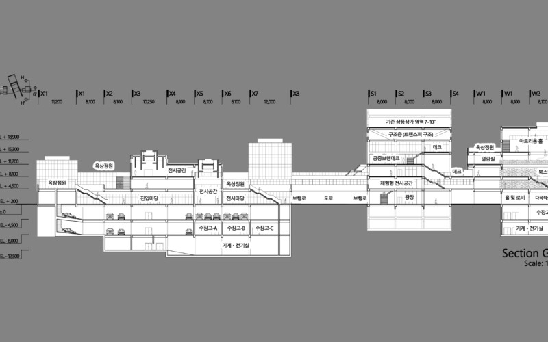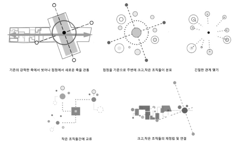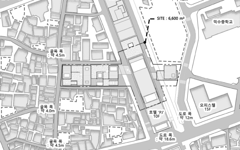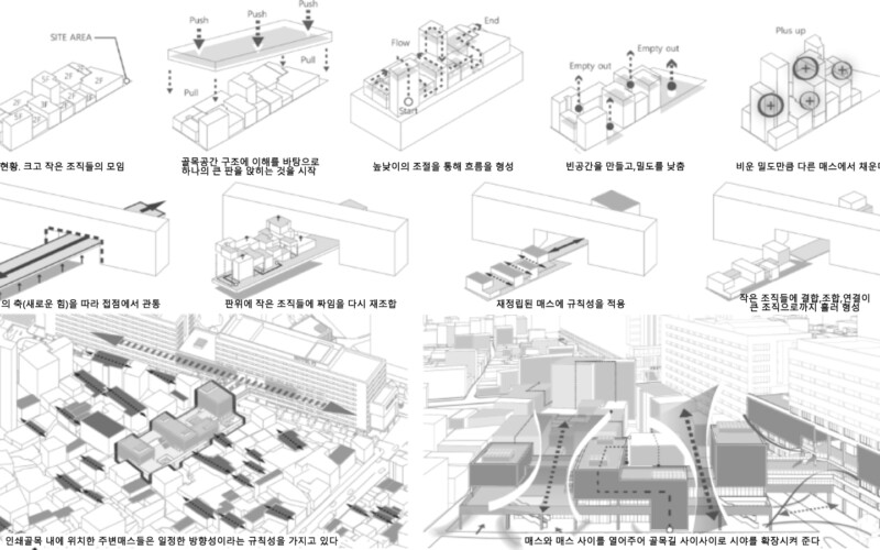 인쇄골목의 공간 구조를 분석했을 때, 이 곳 골목에는 일정한 방향성을 갖는 규칙성이 있었고, 그 규칙은 세운, 삼풍상가군에 강한 축과 평행 또는 직각, 대칭을 이루는 구조 때문이라고 생각했습니다. 이러한 주변 맥락에 대한 분석을 토대로 계획 대지 내 매스들을 재조합하는 프로세스를 거쳤습니다. 기존에 있었던 작은 매스들이 재정립되면서 계획대지에 필지를 따라 삼풍상가군 건물을 관통하여 그 너머로까지 이어지고, 작은 조합들이 큰 조합으로 바뀌는 모습을 보여주고 있습니다.