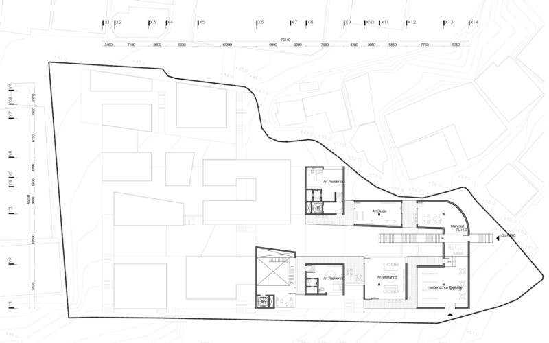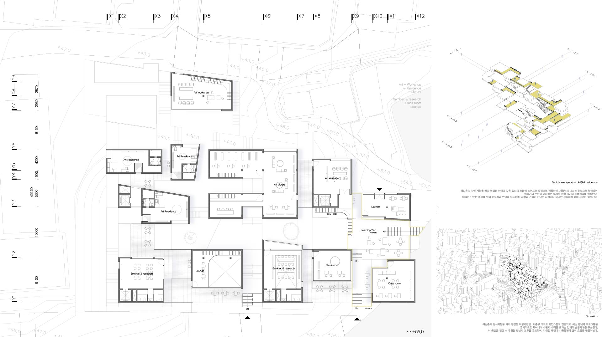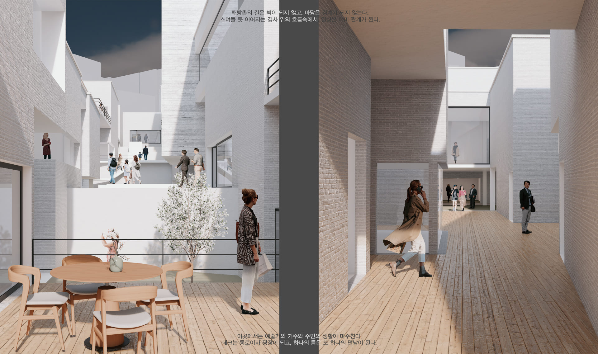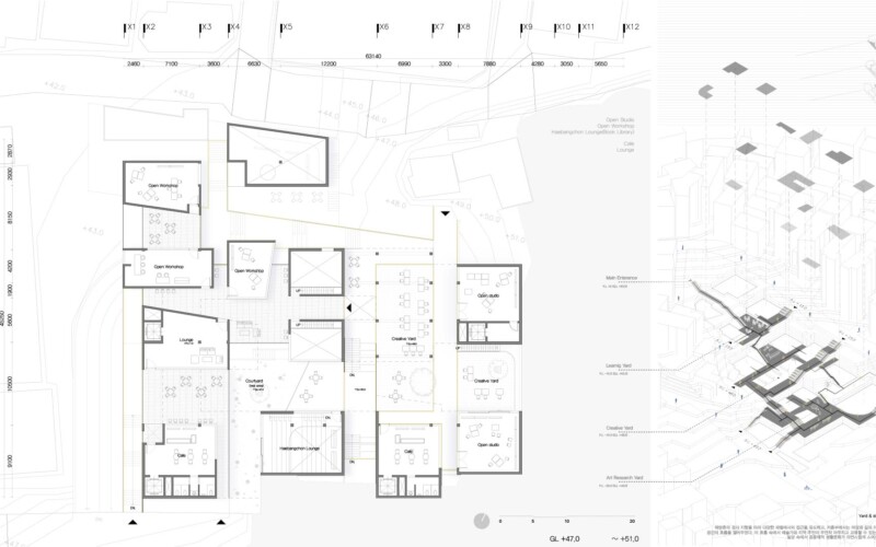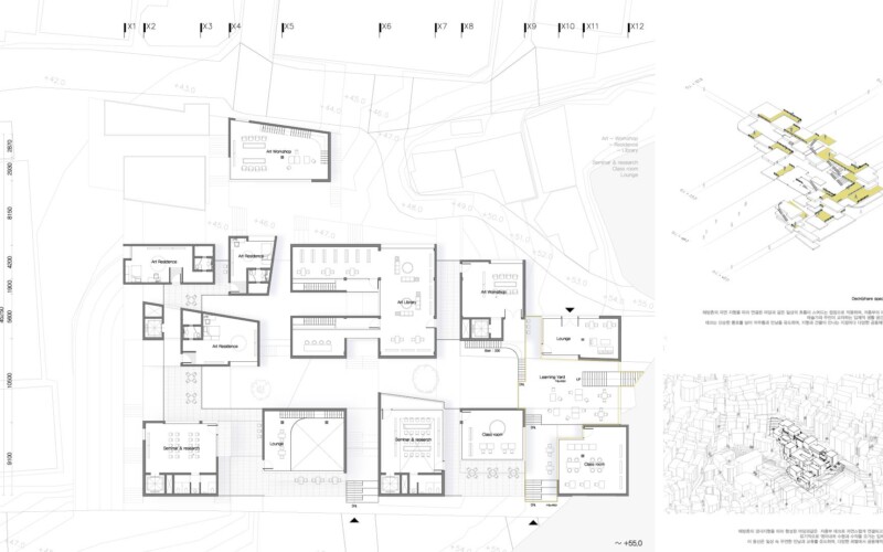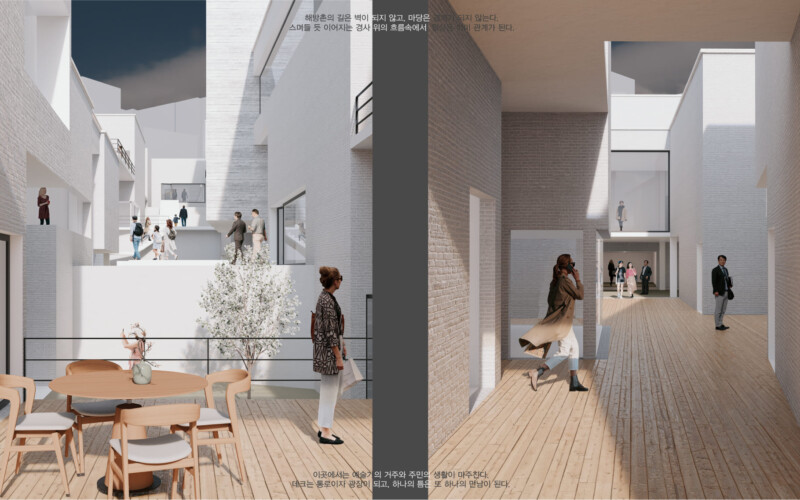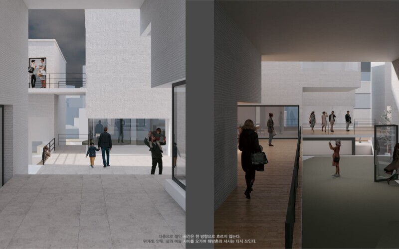 해방촌의 경사 지형을 따라 다양한 레벨에서의 접근을 유도하고, 저층부에서는 마당과 길의 자연스러운 연결을 통해 공간의 흐름을 열어두었다. 이 흐름속에서 예술가와 지역 주민이 우연히 마주치고 교류할 수 있는 여지를 마련함으로써, 일상 속에서 공동체적 생활문화가 자연스럽게 스며드는 공간을 제안한다.