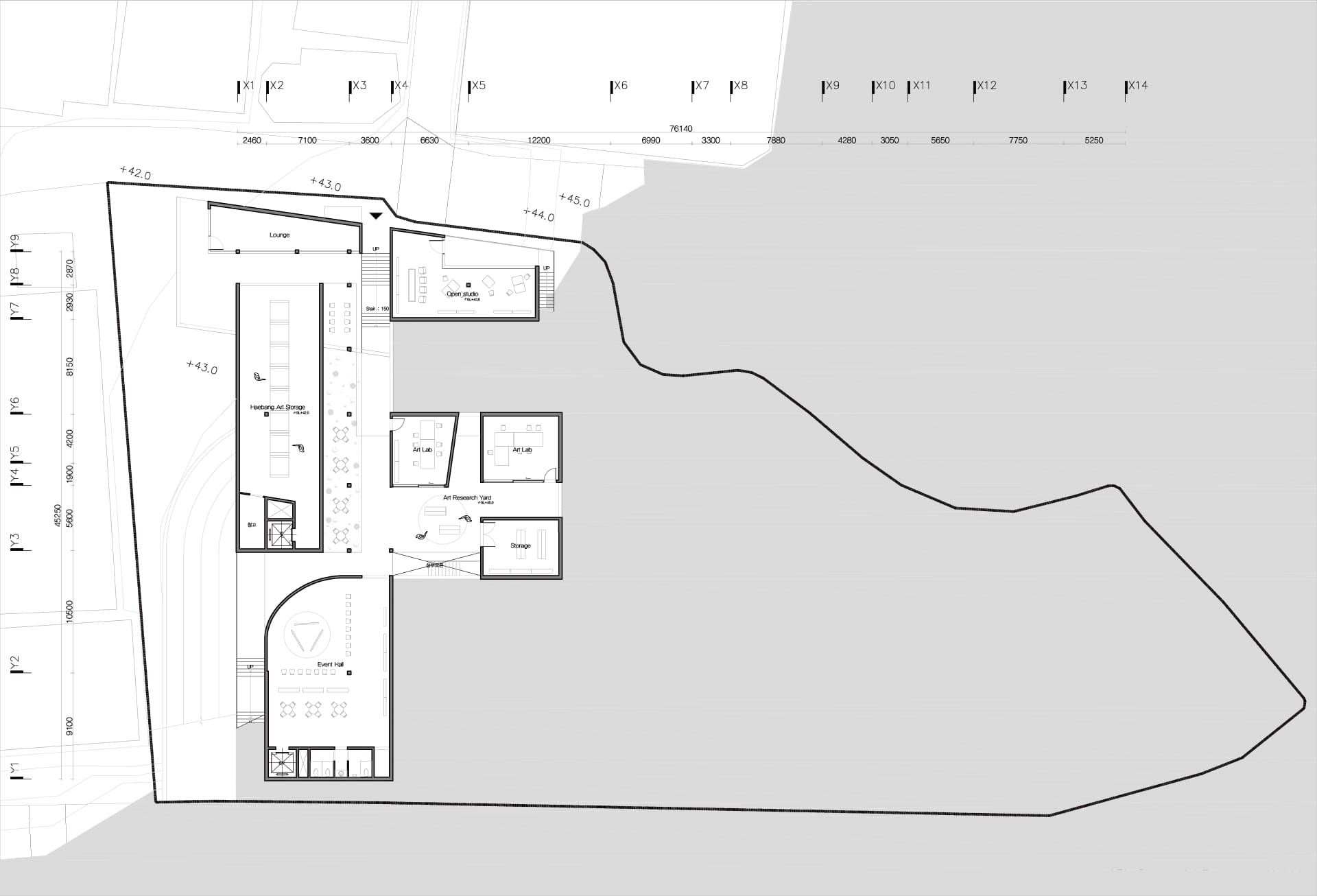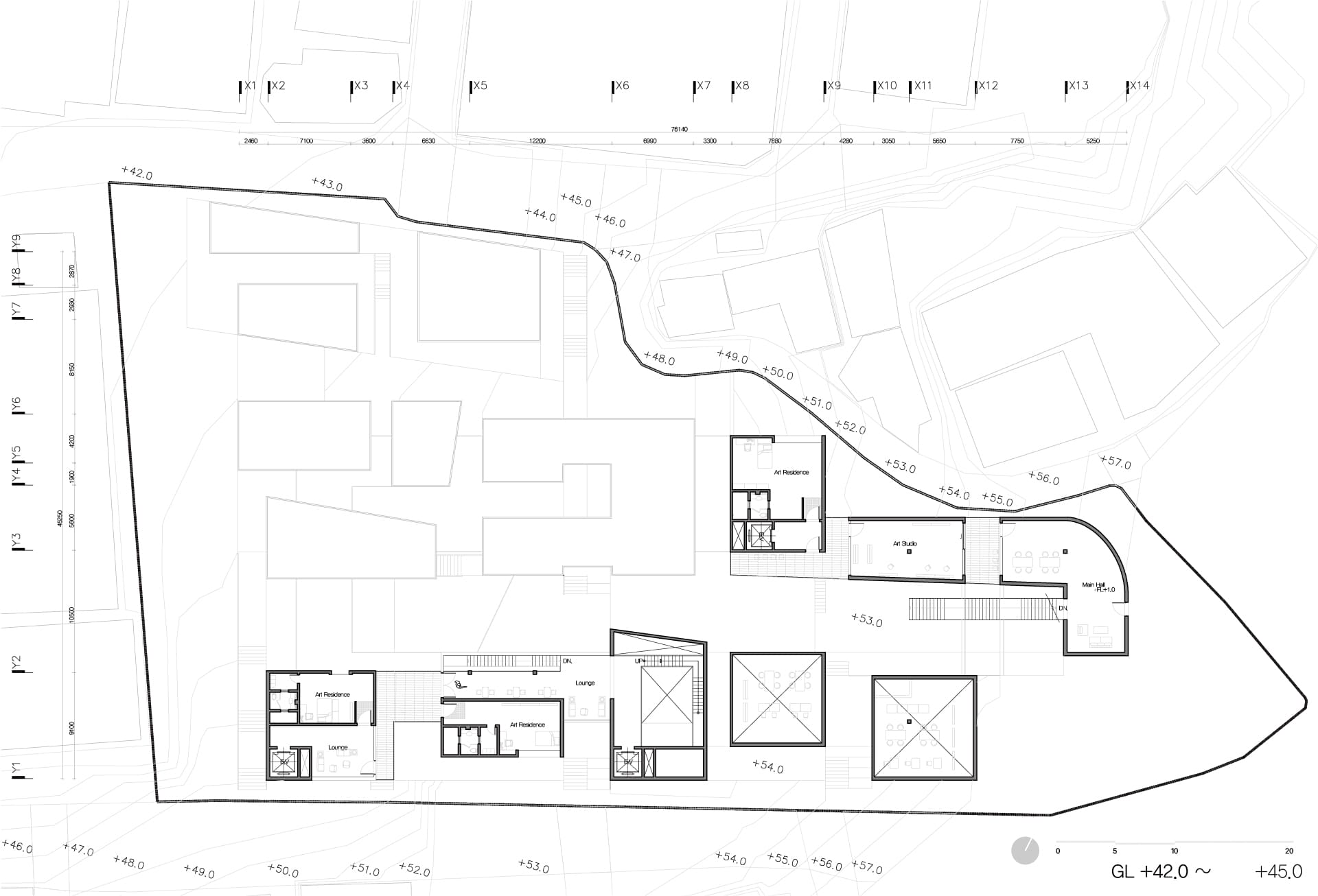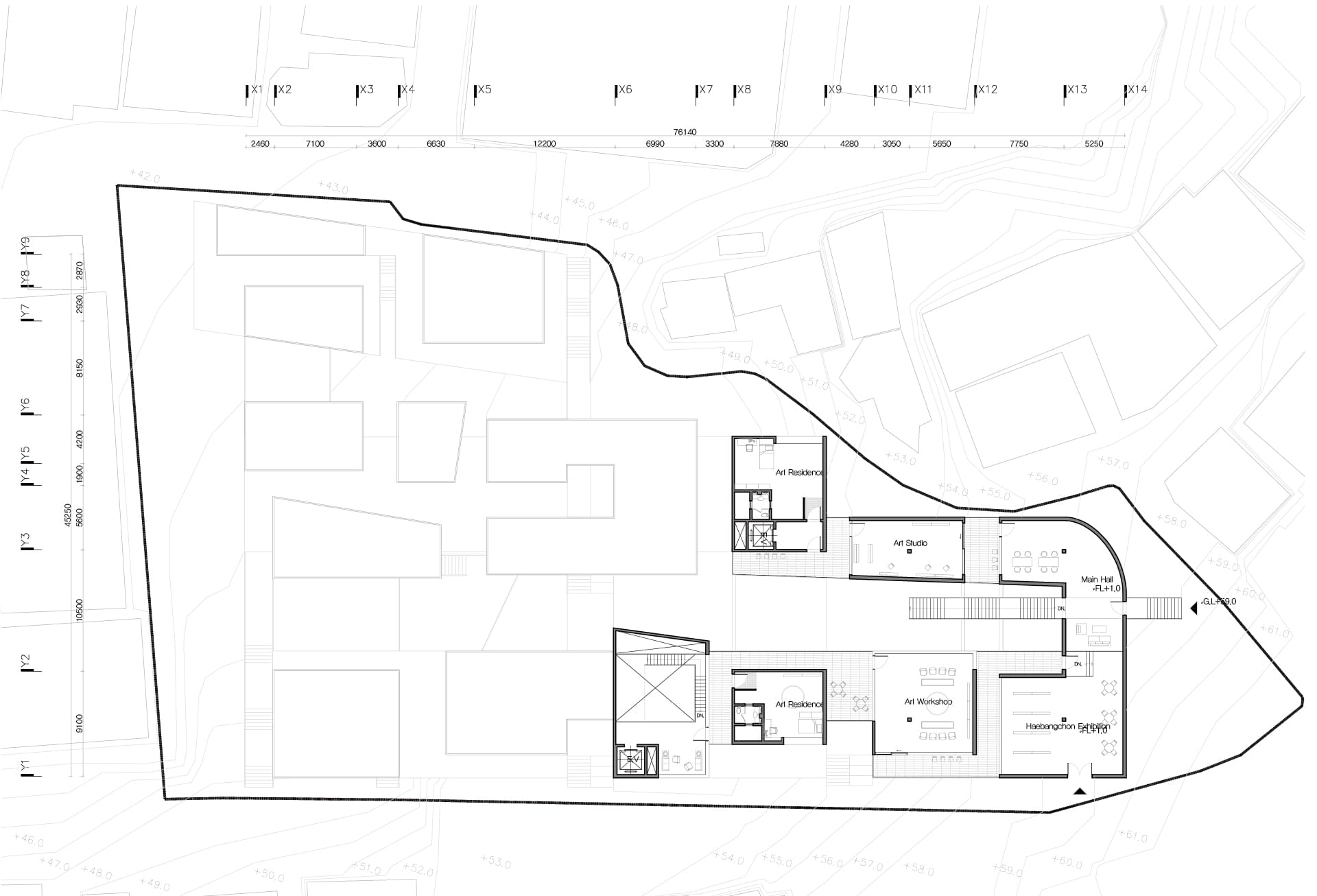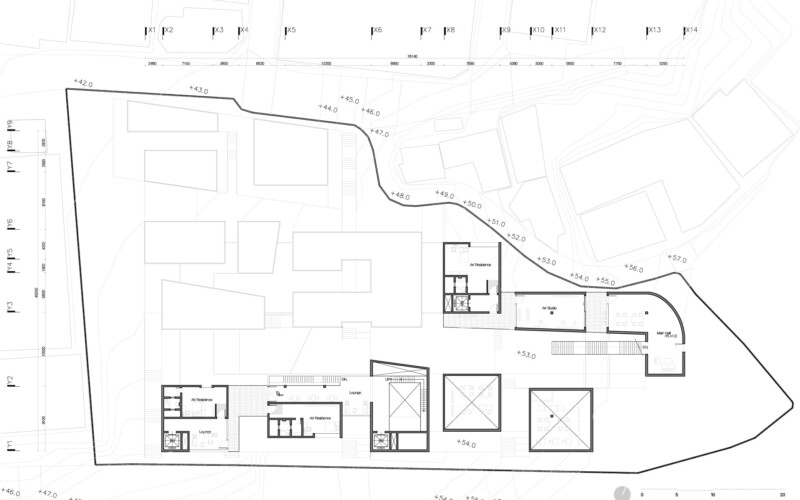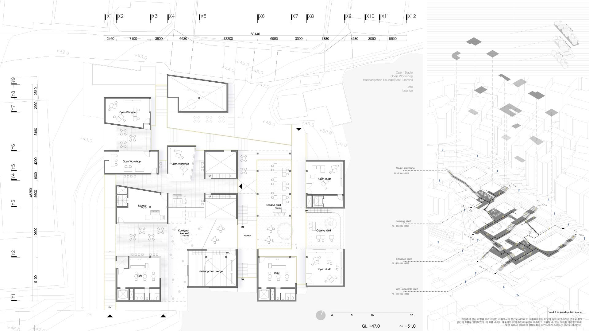 해방촌의 경사 지형을 따라 다양한 레벨에서의 접근을 유도하고, 저층부에서는 마당과 길의 자연스러운 연결을 통해 공간의 흐름을 열어두었다. 이 흐름속에서 예술가와 지역 주민이 우연히 마주치고 교류할 수 있는 여지를 마련함으로써, 일상 속에서 공동체적 생활문화가 자연스럽게 스며드는 공간을 제안한다.