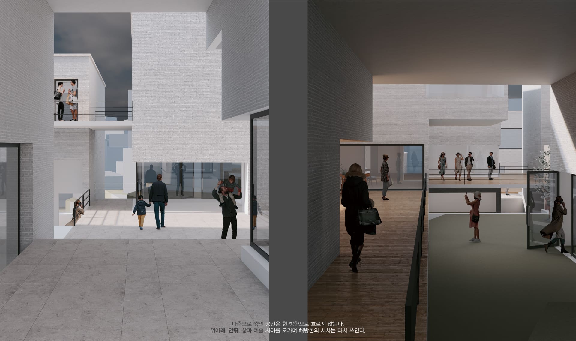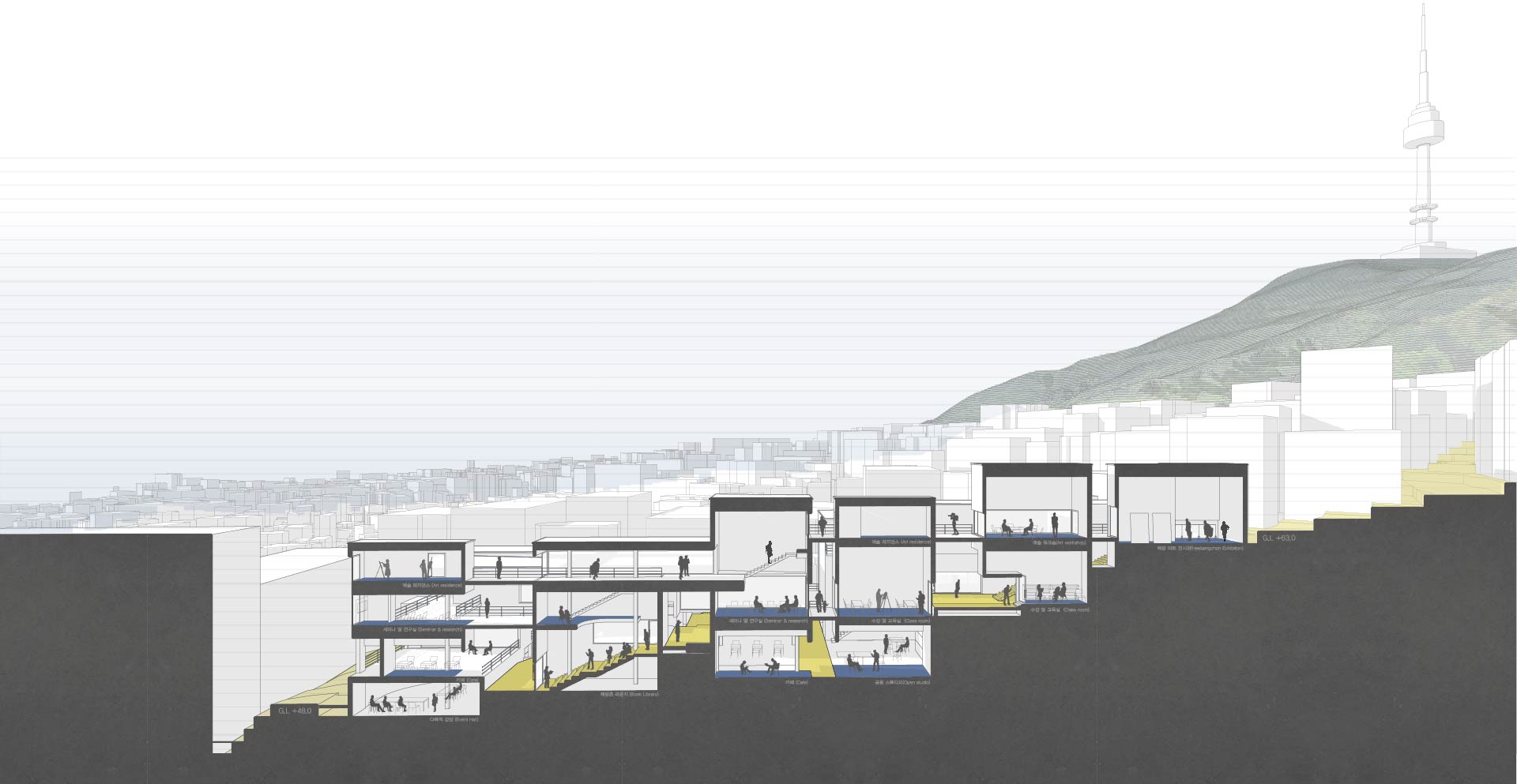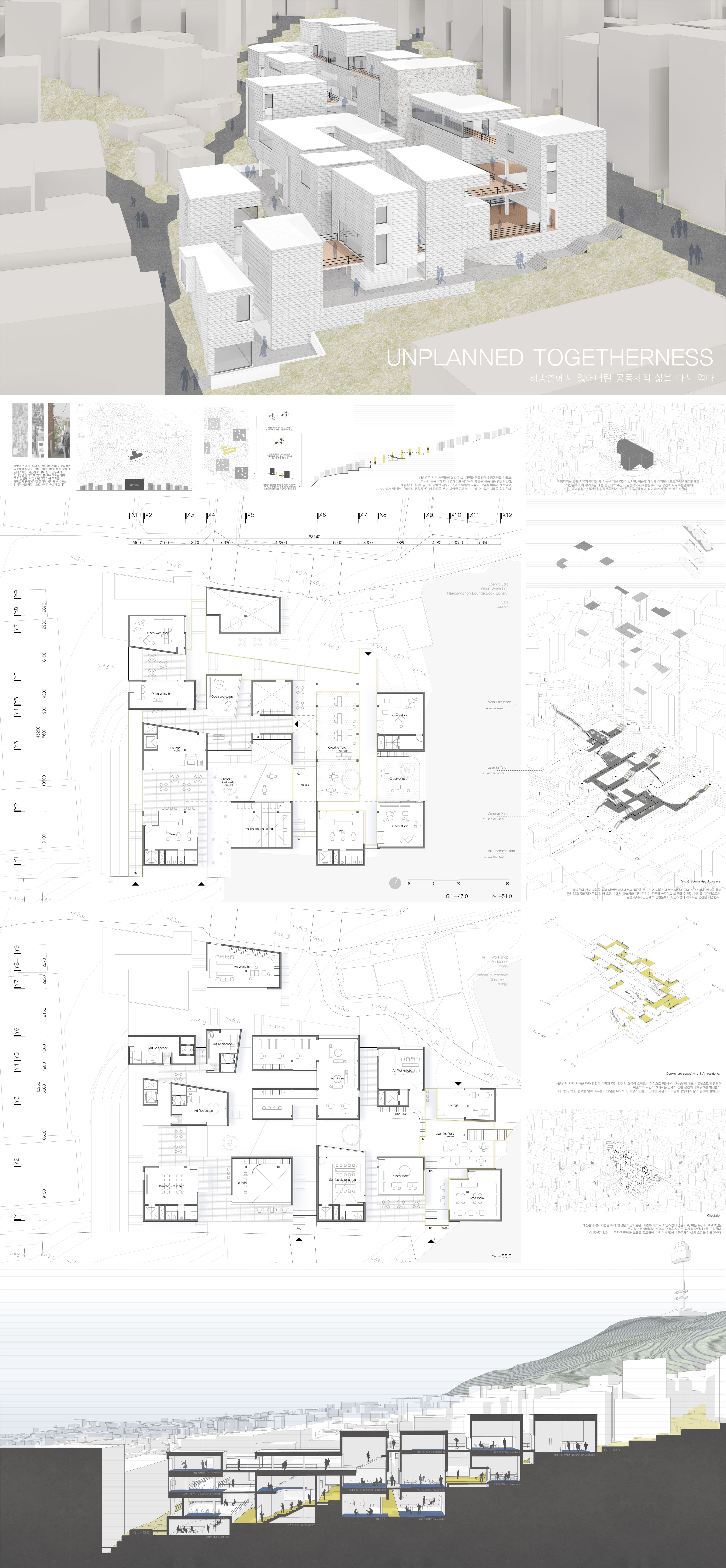 해방촌은 과거, 삶의 필요를 공유하며 비공식적인 공동체적 유대로 모여든 이주민들에 의해 형성된 동네였지만, 시간이 지나며 점차 공동체적 정체성을 잃어가고 있다. 본 프로젝트는 현재 크고 단절된 채 방치된 해방타워 부지를, 해방촌의 공동체적인 문화적 기억을 회복하는 ‘입체적 생활공간’으로 재해석하고자 한다.
