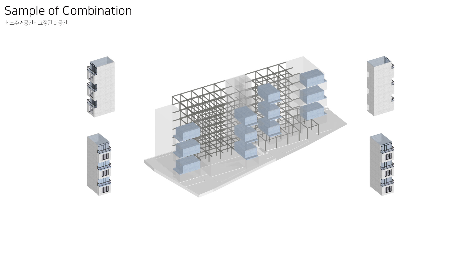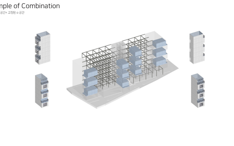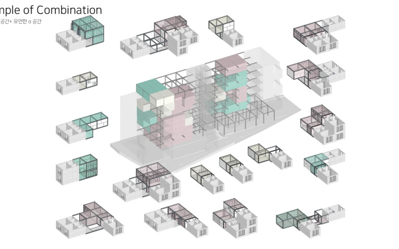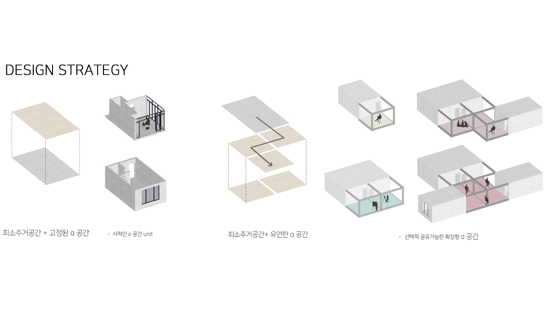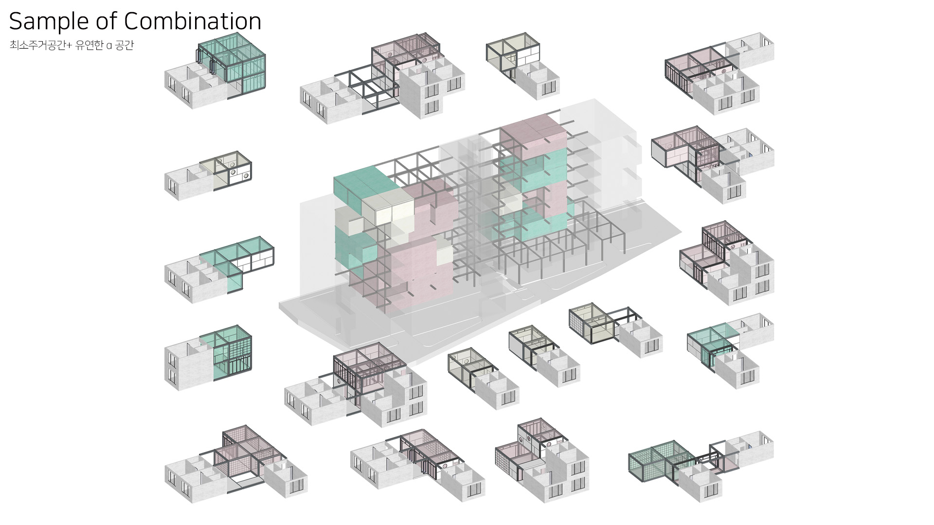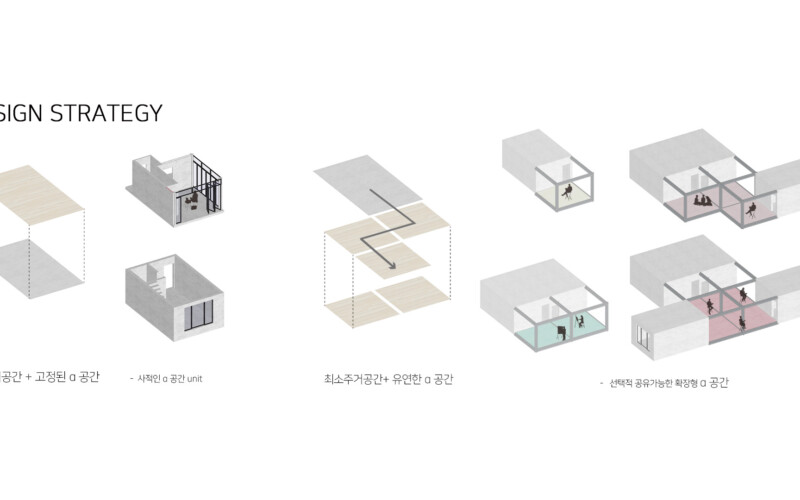 이러한 유닛 구조는 전통적으로 2인, 3인 혹은 그 이상의 가구 구성원 수에 따라 규정되던 주거 단위를 대체한다. 대신, 각 세대는 기본적인 생활을 충족하는 최소 주거 공간과 함께, 변형 가능한 알파 스페이스를 조합하여 새로운 주거 형태를 형성한다. 알파 스페이스는 필요에 따라 독립적인 개인 공간으로도, 혹은 공동의 활동을 위한 공유 공간으로도 활용될 수 있다. 즉, 사용자의 선택에 따라 주거 단위가 조합되고 재편성되는 유연성을 지닌 주거형태를 이프로젝트를 통해 제안한다.