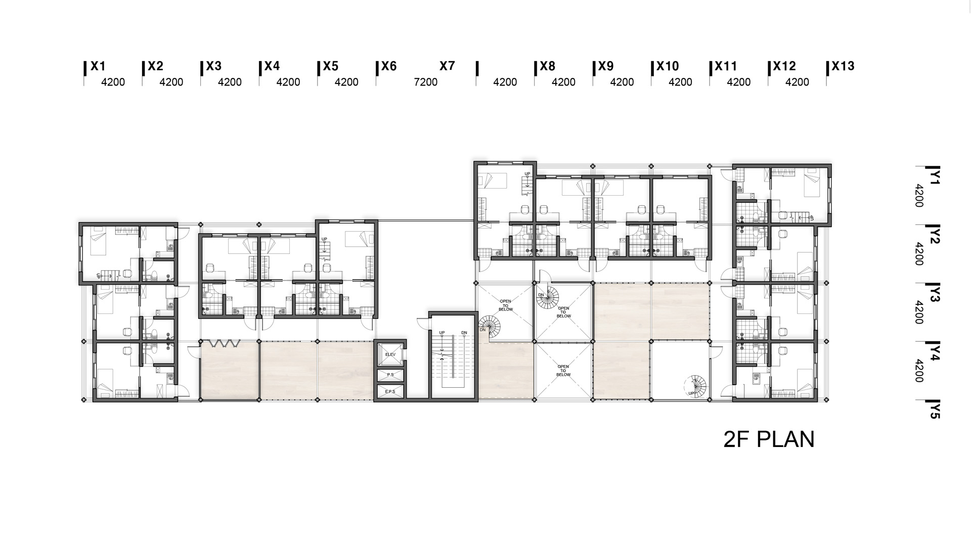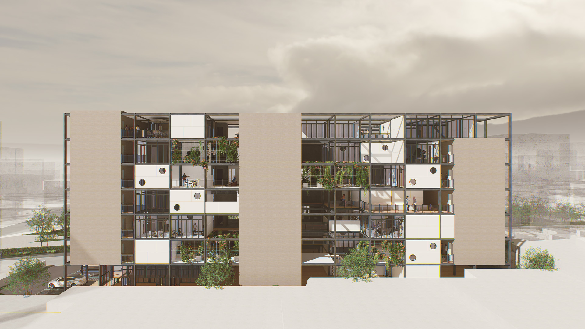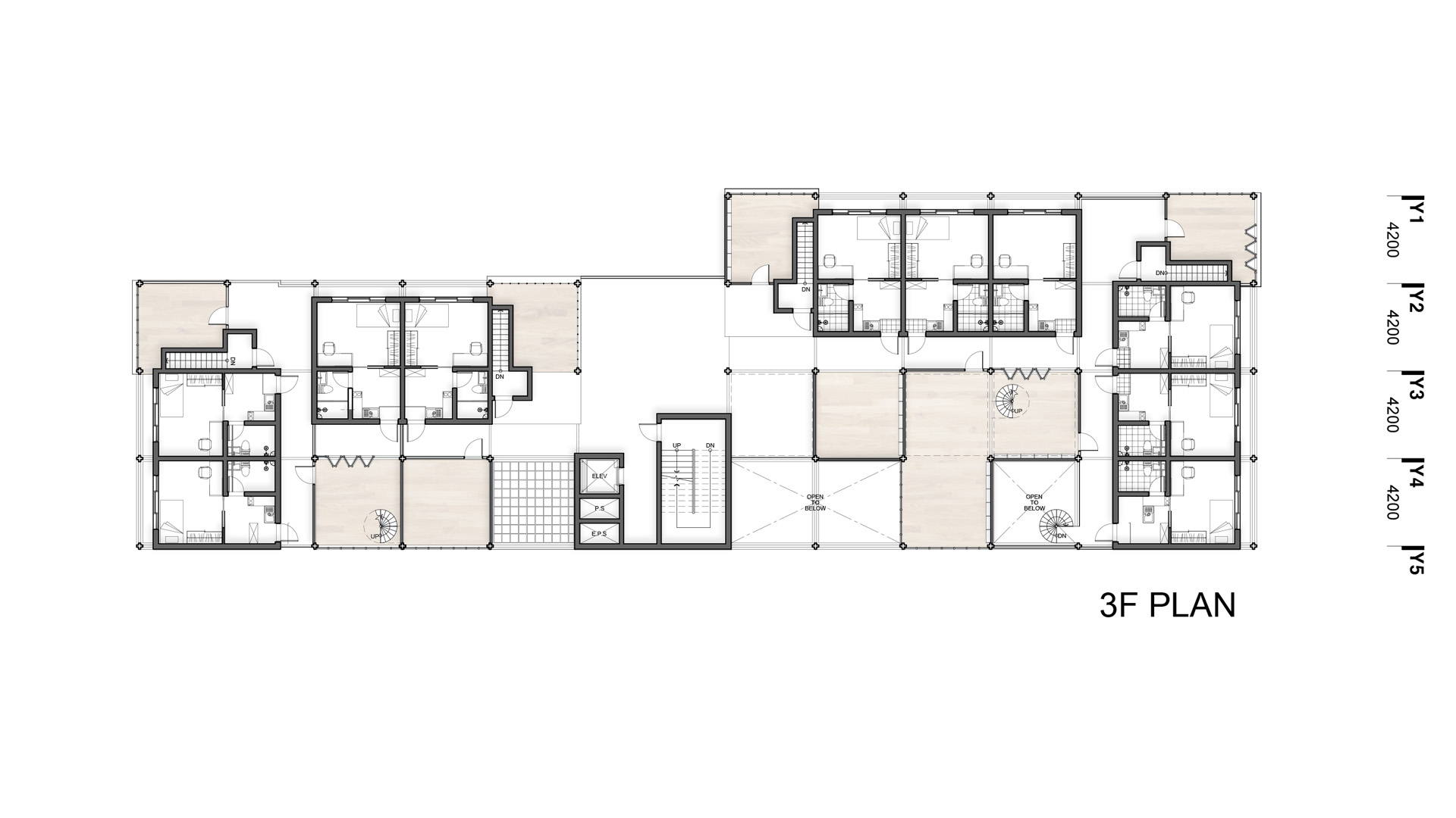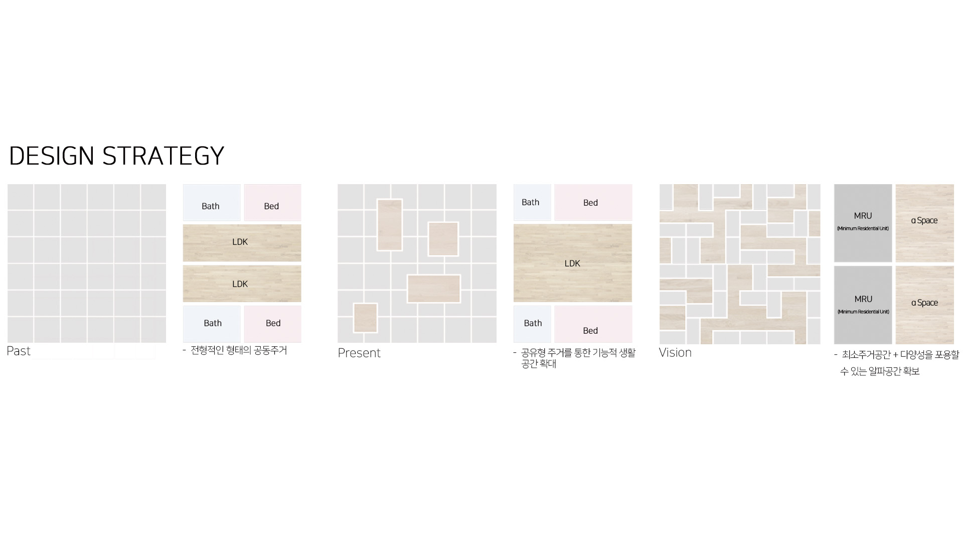 이러한 유닛 구조는 전통적으로 2인, 3인 혹은 그 이상의 가구 구성원 수에 따라 규정되던 주거 단위를 대체한다. 대신, 각 세대는 기본적인 생활을 충족하는 최소 주거 공간과 함께, 변형 가능한 알파 스페이스를 조합하여 새로운 주거 형태를 형성한다. 알파 스페이스는 필요에 따라 독립적인 개인 공간으로도, 혹은 공동의 활동을 위한 공유 공간으로도 활용될 수 있다. 즉, 사용자의 선택에 따라 주거 단위가 조합되고 재편성되는 유연성을 지닌 주거형태를 이프로젝트를 통해 제안한다.