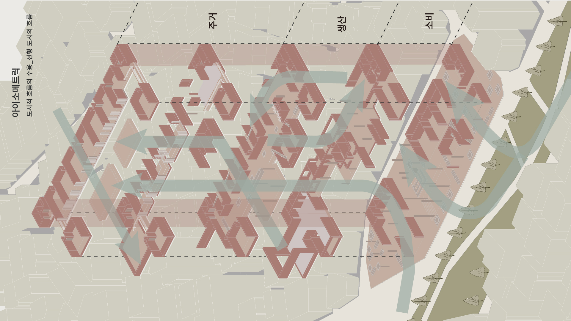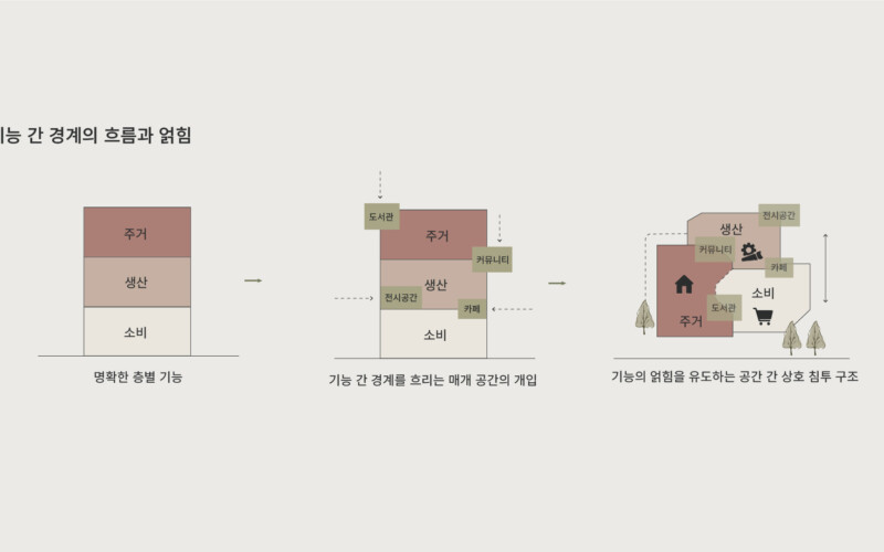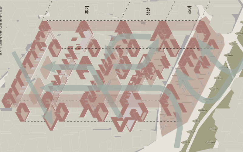 우리는 서울 도심을 걷다 보면 경의선 숲길이라는 선형적 흐름과 그 주변의 대비적인 환경을 마주하게 됩니다. 한쪽에는 소비 중심의 건물들이 있고, 다른 한쪽에는 주거지와 소규모 작업장들이 이어집니다. 저는 이 두 흐름 사이에서 새로운 삶의 방식이 탄생할 수 있지 않을까 하는 문제의식에서 출발했습니다. 그 결과, 도시의 기본 기능인 생산·소비·주거가 분리되지 않고 자연스럽게 얽히는 공간을 제안하게 되었습니다.