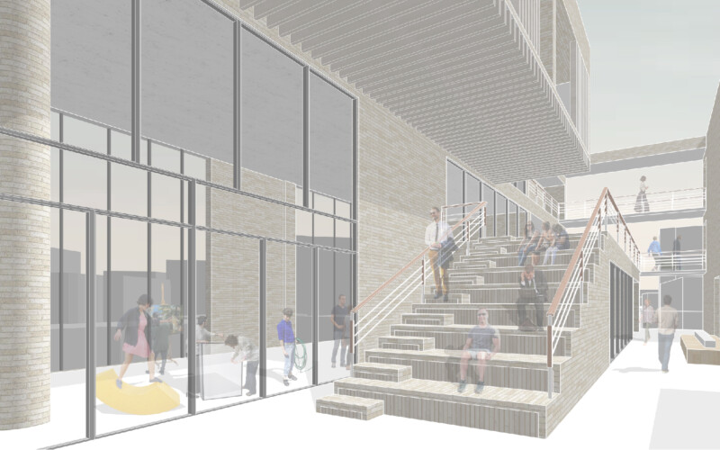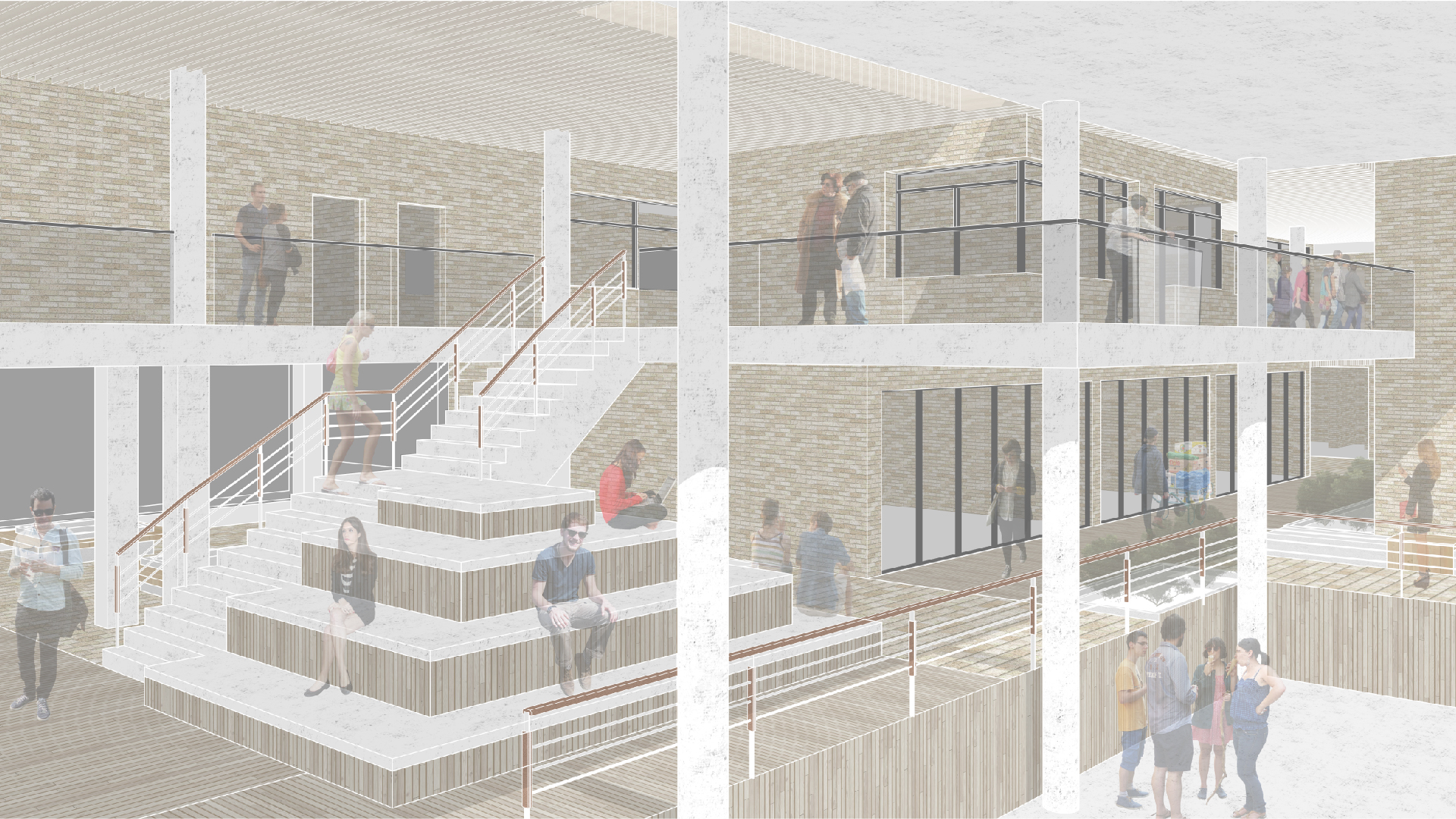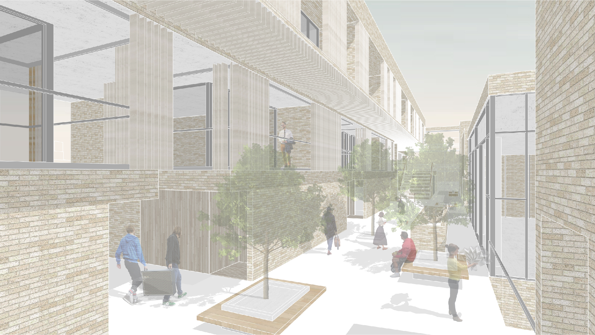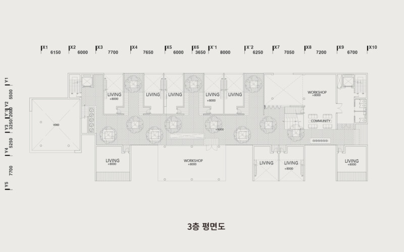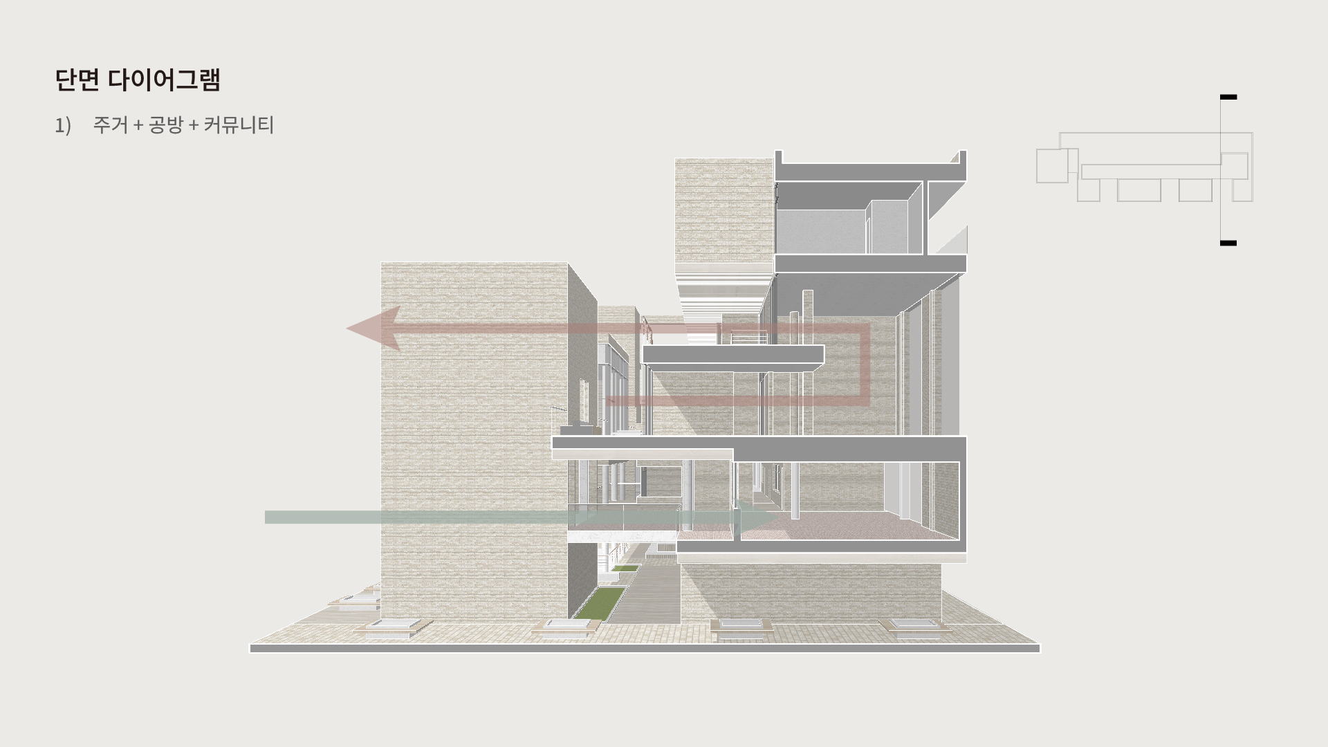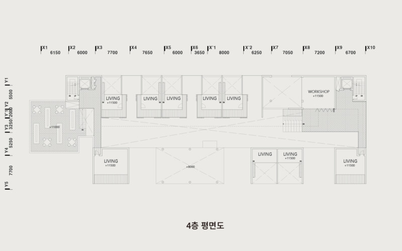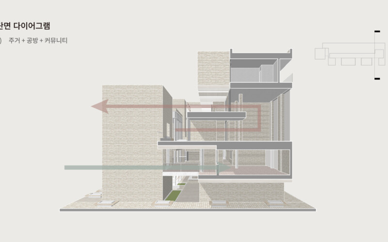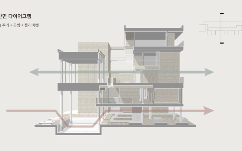 설계 과정에서 저는 경의선 숲길의 선형적 흐름을 건축 내부로 끌어들였습니다. 그리고 이 흐름이 단순한 이동 통로에 그치지 않고, 머무를 수 있는 면적의 흐름으로 확장되도록 했습니다. 그 결과 공간 안에는 ‘틈(GAP)’이 만들어졌습니다. 이 틈은 단절이 아니라 오히려 연결의 가능성을 담고 있습니다. 예를 들어, 주거와 생산 사이에는 커뮤니티 라운지를 두고, 생산과 소비 사이에는 카페나 전시 공간 같은 매개 공간을 배치해 기능의 경계를 흐리게 했습니다. 이렇게 기능은 구분되지만 관계는 유연하게 이어지는 구조가 형성됩니다. 이러한 흐름과 중첩은 사용자가 도시와 건축, 그리고 삶의 장면을 걷고 체험할 수 있는 방식으로 작동합니다.