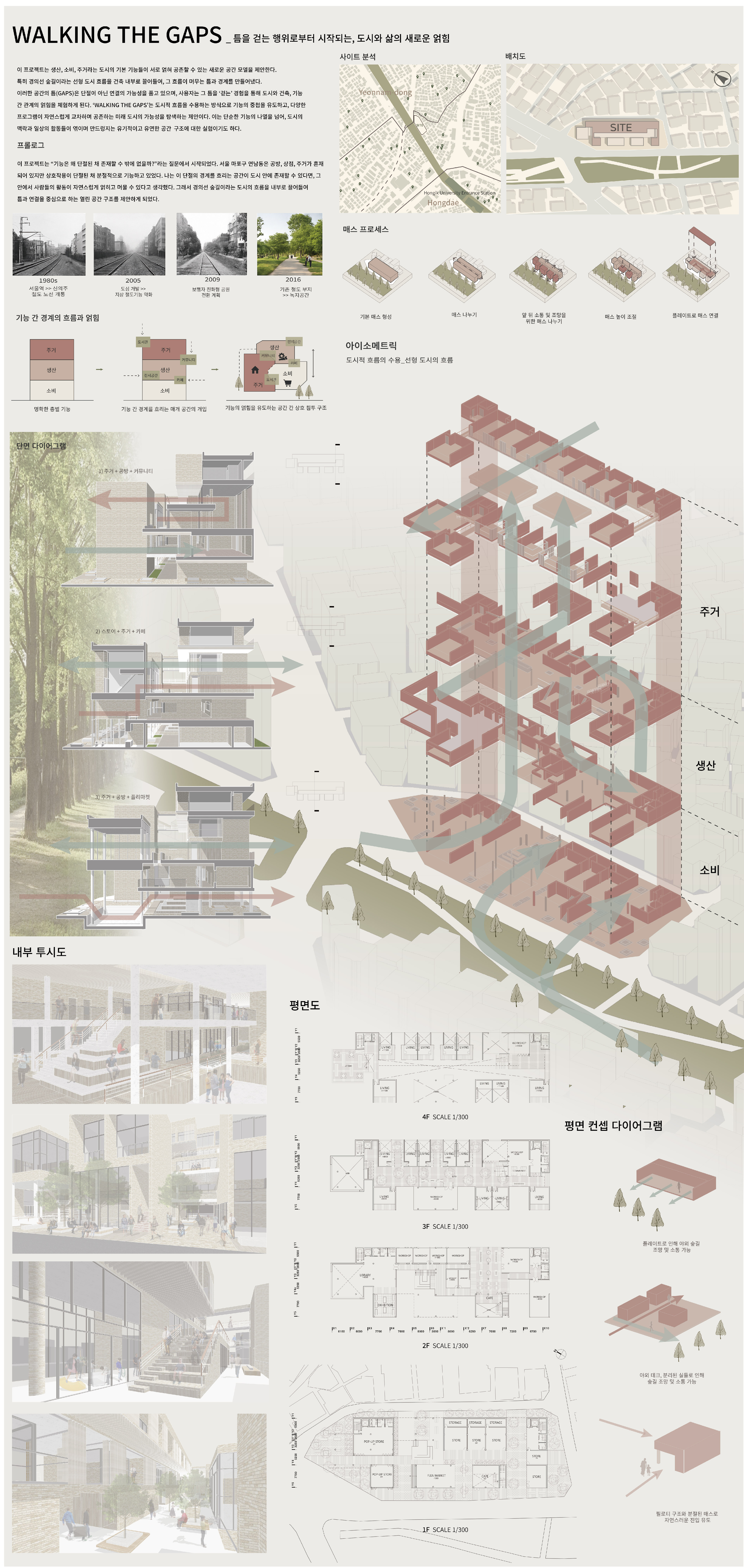 결국 이 설계는 단순한 기능 배치가 아니라, 흐름과 틈, 그리고 경계의 전략을 통해 새로운 삶의 방식을 제안하는 시도입니다. 도시는 점점 더 복합적으로 얽히고 있으며, 이를 담아내는 건축 역시 유연하고 중첩된 구조로 변화해야 한다고 생각합니다. “Walking the Gaps”는 이러한 흐름을 걷는 사람의 시선에서 바라본 도시의 단면이자, 미래 도시의 가능성에 대한 탐색입니다.