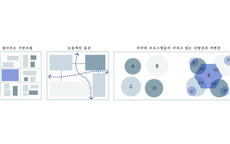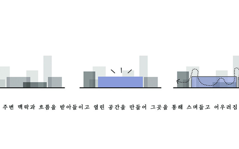 따라서 이러한 문제점을 보완한 ‘다양한 프로그램이 자리잡고 있는 열린공간’으로 방향을 정했고, 그 열린공간 속에서 다양한 내외부 공간이 생성되고 그 공간들이 서로 커뮤니케이션이 형성될 수 있도록 한다.