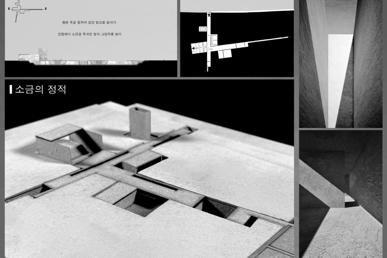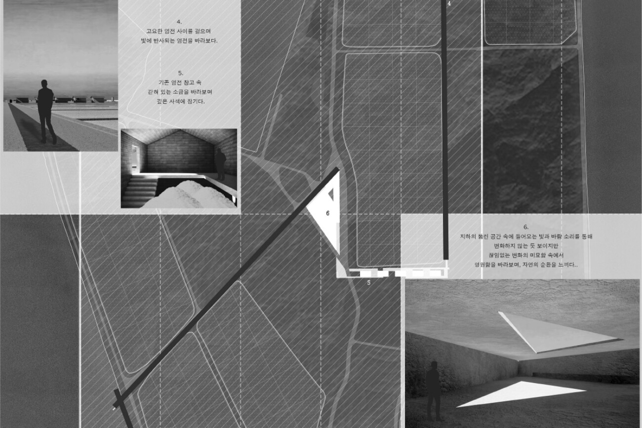 건물 진입부: 관람객은 건물에 들어가 염전을 다른 각도에서 바라보며, 자신의 내면을 들여다보는 시간을 가집니다. 이 과정에서 깊은 생각과 감정을 마주하게 됩니다.