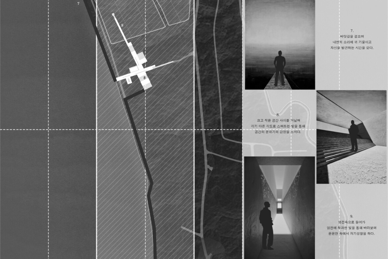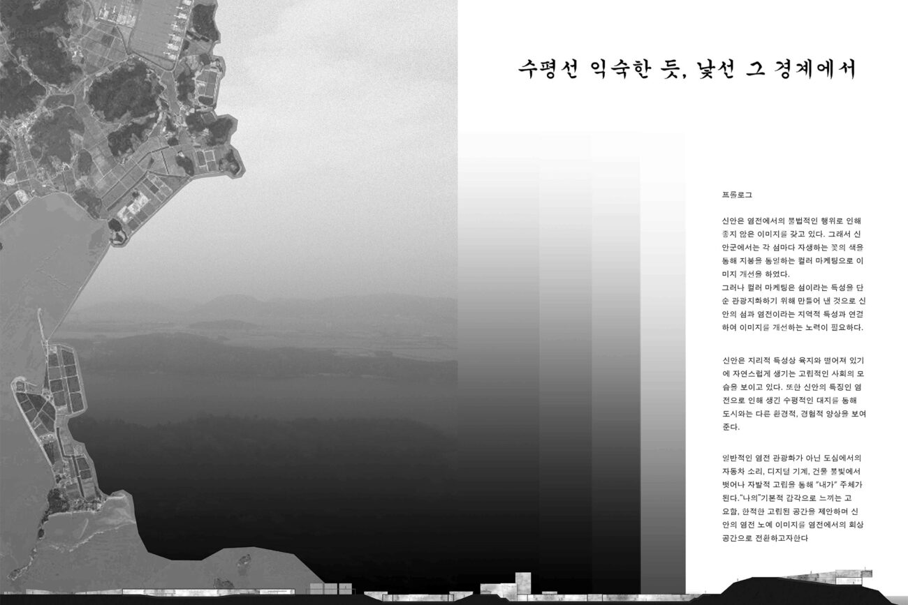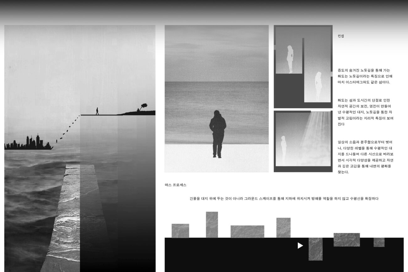 이러한 공간들은 신안의 섬과 염전의 특성을 살려 관람객에게 새로운 경험을 제공합니다. 각 공간은 환경과 어우러져 관람객이 자연과 깊이 연결될 수 있는 기회를 제공합니다. 궁극적으로, 이 설계안은 신안의 이미지를 개선하고, 관람객이 내면의 소리를 듣고 자기성찰을 할 수 있는 공간을 창출하는 것을 목표로 합니다. 화도의 노둣길은 이러한 경험의 시작점이자, 고립과 연결의 상징으로서 중요한 역할을 합니다.