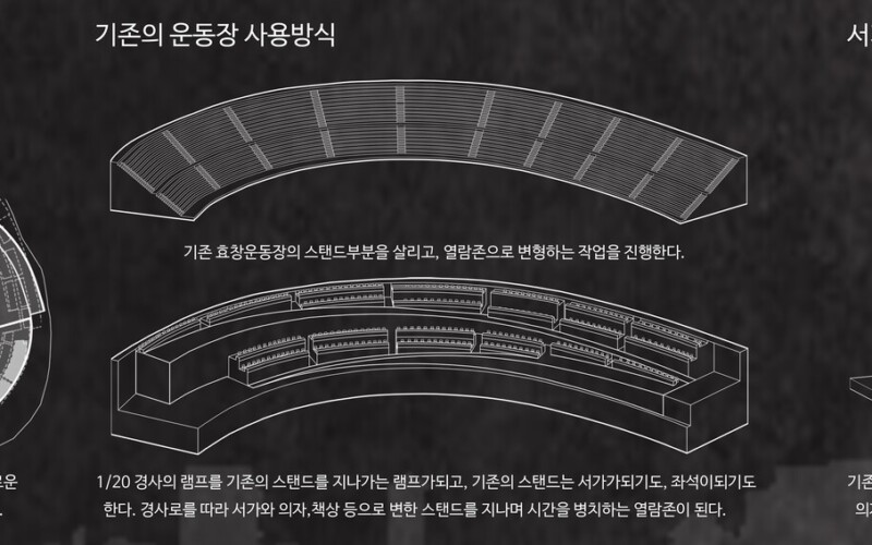 프로젝트의 사이트는 서울 용산에 위치한 효창공원이다. 효창공원은 ‘서울 용산’이라는 도심 한가운데에서 다양한 역사가 얽히며 공원으로 존재하고 있는 장소이다. 사이트는 조선시대때 왕의릉으로 사용되기 시작하며 역사가 시작되었다가 일제강점기에는 골프장으로, 해방이후에 독립투사들의 묘역이 들어서며, 1960년도에는 정치의 개입으로 인한 효창운동장이 들어서 많은 의미가 내포되어있는 장소이다.현재 효창공원에는 독립 투사들의 묘역,효창운동장,김구기념관, 노인복지시설까지 들어서있는 상태이고,조그만한 효창공원에 많은 의미가 들어섬에 따라 결국 아무의미도 얻지못하고 다양한 시간의켜들이 난잡하게 얽혀있는 상태이다. 이러한 상황속에서 현재 지금, 과거의 시간들의의미를 존중하며 난잡한 현상태를 통합하기 위해, 효창운동장을 효창도서관으로 리노베이션 하는 프로젝트를 제안한다. 도서관은 현대에 있어더이상 책을 읽고 공부를 하기위해 찾는 장소가 아닌, 지역주민들의 니즈를 충족하고, 다양한 문화생활을 즐길 수 있는 장소라고 생각한다. 이러한 관점에서 효창운동장을 효창도서관으로 리노베이션하는 과정을 통해 기존의 효창운동장의 역사를 기억하며, 효창공원 내의 다양한 시간을통합할 수 있는 장소로 변모할 수 있다고 생각한다.이 프로젝트의 가장 큰 관점은 다양한 시간이 얽혀있는 장소에서 인간의삶을 담을 담아내는 ‘건축’에서는 어떠한 태도를 취할수 있는지 건축의과정속에서 무엇이 존중되어야 하는가에 대해서이다. 이러한 관점에서효창공원은 다양한 시간대의 역사가 서로 어울리지 못하고 난잡하게 존재한다. 과거의 시간들이 설령 좋든 싫든 그것은 우리의 역사이다. 이 프로젝트는 우리들의 시간의 켜를 통합하는 과정에서 서로 다른 시간을 병치하여 이것들 또한 우리의 시간임을 의미한다.